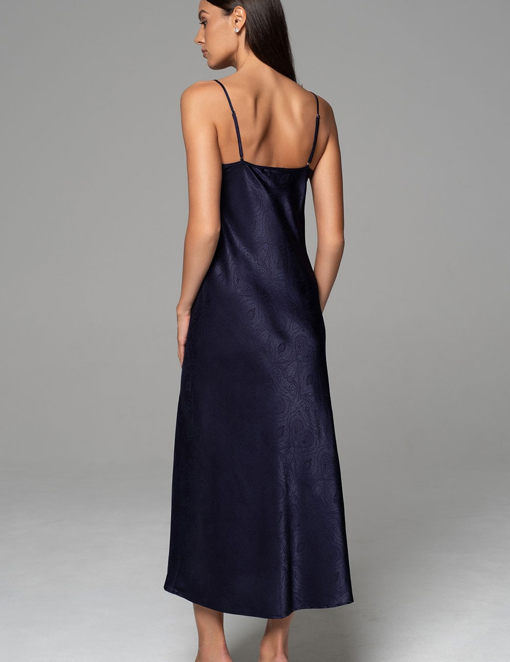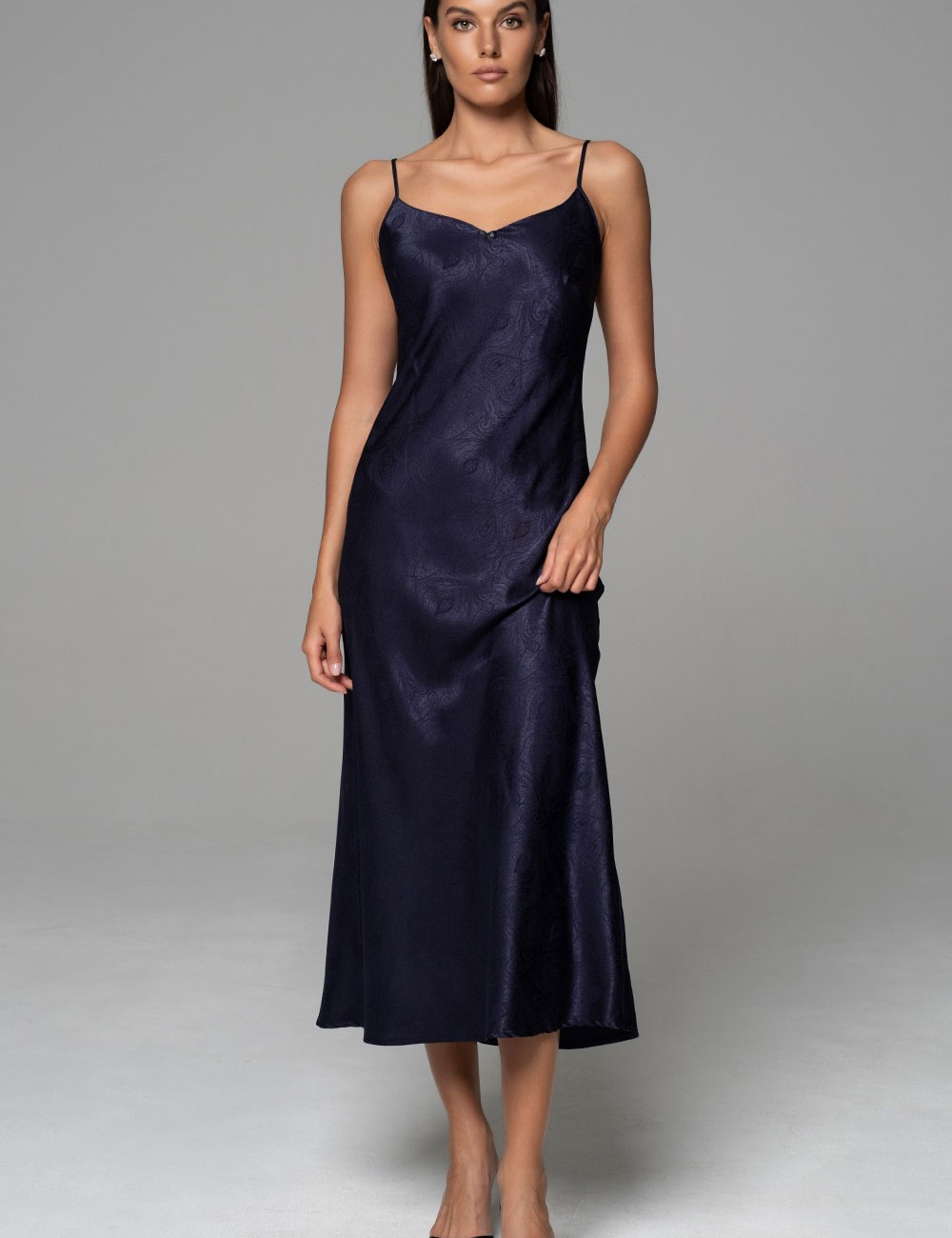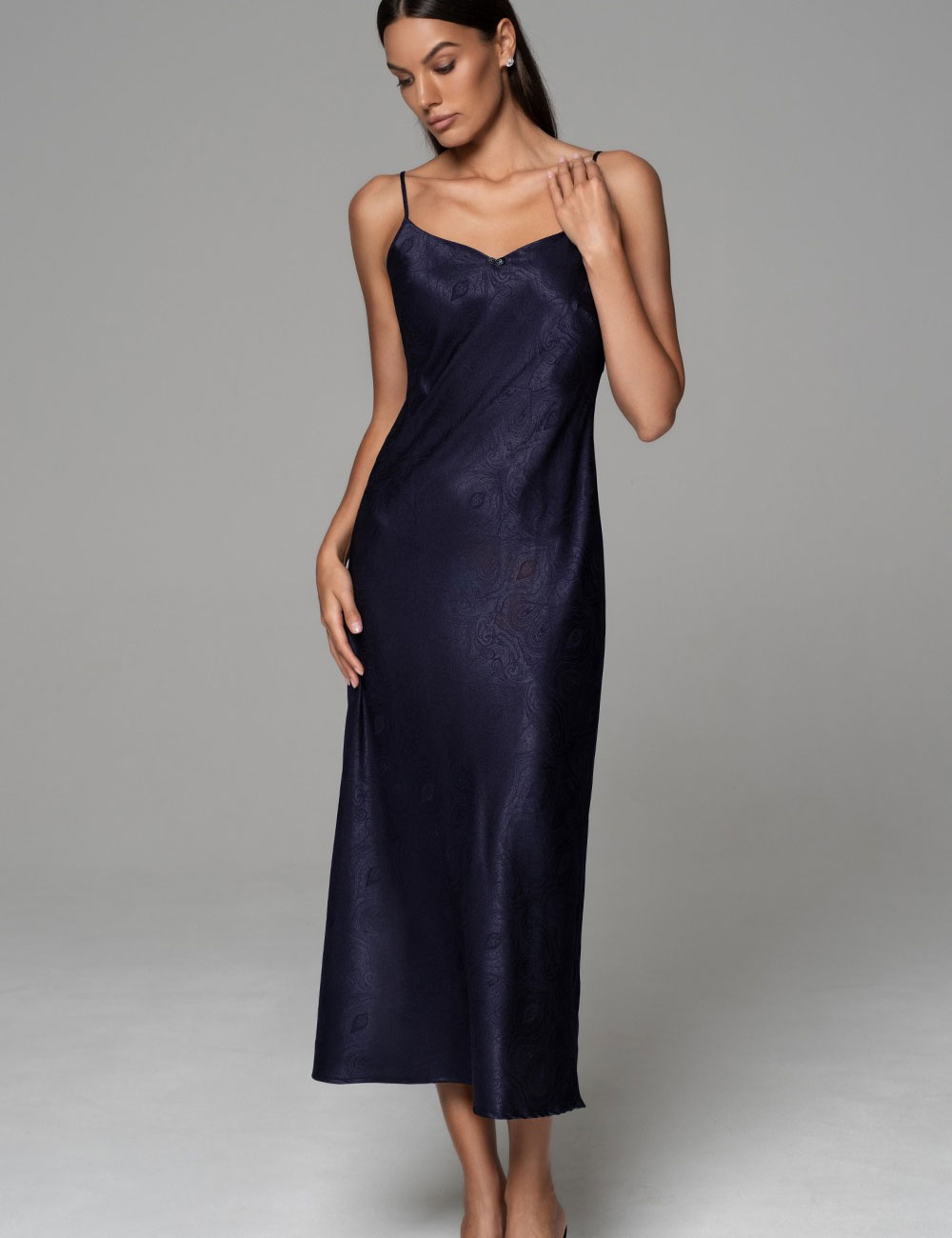 Длинная ночная сорочка на тонких бретелях Mia-Amore ANORA 4804 в темно-синем цвете. Изготовлена из смесового натурального шелка с жаккардовым узором. Создает атмосферу роскоши и комфорта, подчеркивая женственность. Помогает расслабиться с заботой о себе. Подходит для домашнего отдыха в любое время.
