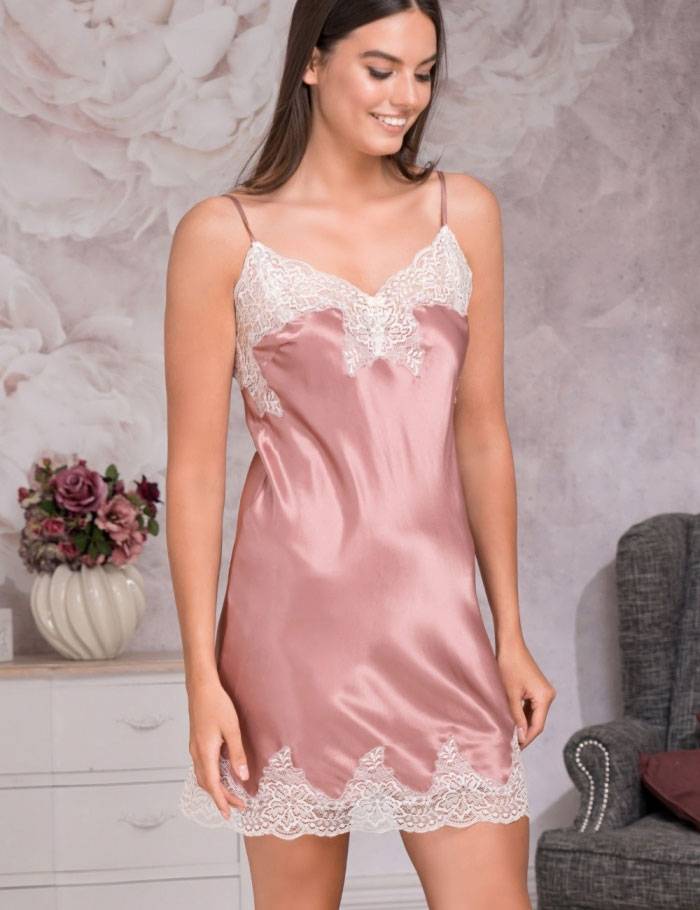 Ночная короткая сорочка MARILIN DELUXE 3440 от Mia-Amore в розовой гамме — мягкий натуральный смесовый шёлк нежно прикасается к телу, а ажурное мягкое кружево с вырезанной кромкой ткани дарит изысканность. Идеальна для сна, и для тех для моментов, когда вечер становится праздником.