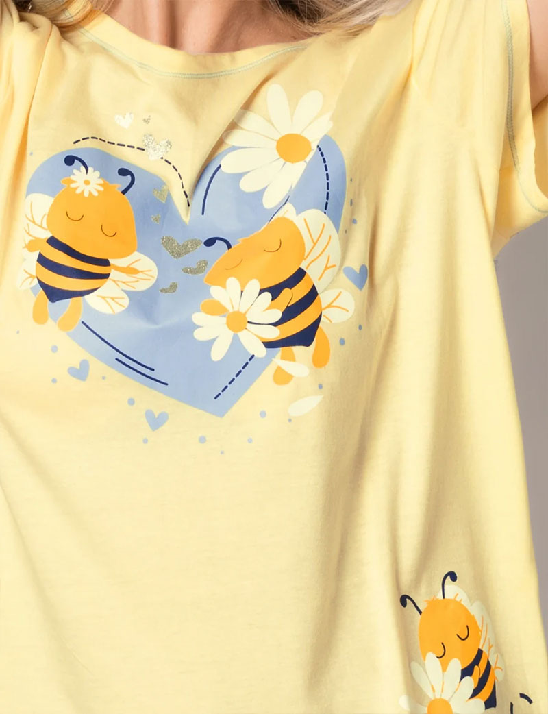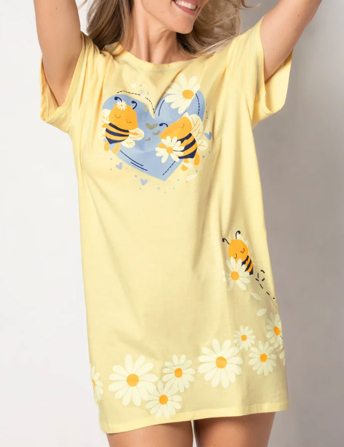 Желтая сорочка Sielei DAISY DA42 из 100% хлопка — мягкая, лёгкая и дышащая, идеально подходит для весны и лета. Принт с пчелками на фоне и декоративный подол с ромашками создают тёплое весеннее настроение. Крой делает её удобной для сна и повседневного отдыха — можно носить как свободную футболку.