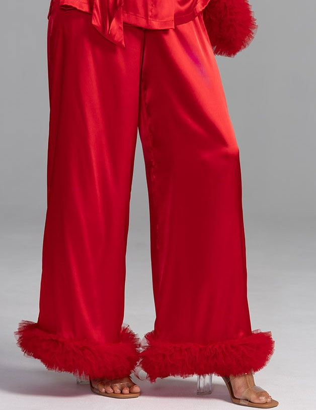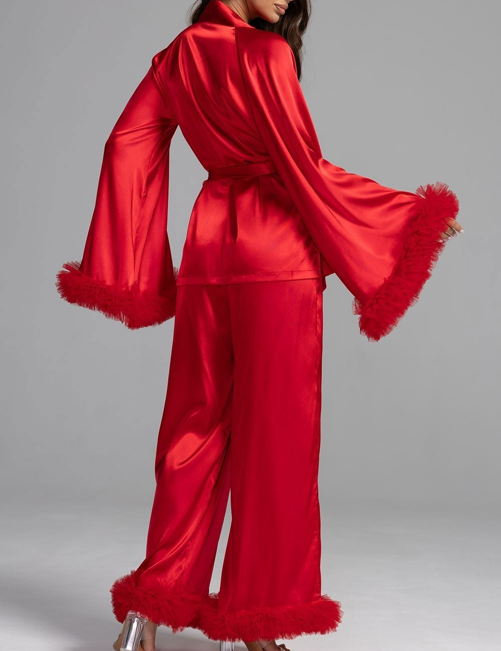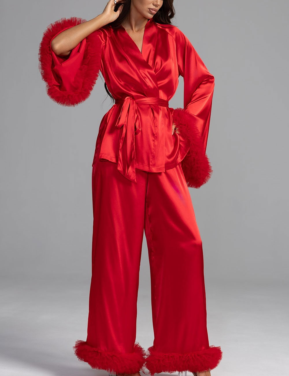 Роскошная красная пижама Mia-Amore 2316 из коллекции LOLI: широкие брюки и короткий запашной халатик из блестящего мягкого атласа, с пышной многослойной рюшей. Блеск ткани подчёркивает соблазн, даря настроение праздника. Лёгкая и притягательная, она идеальна для сладких снов с ноткой искушения и женственной силы.