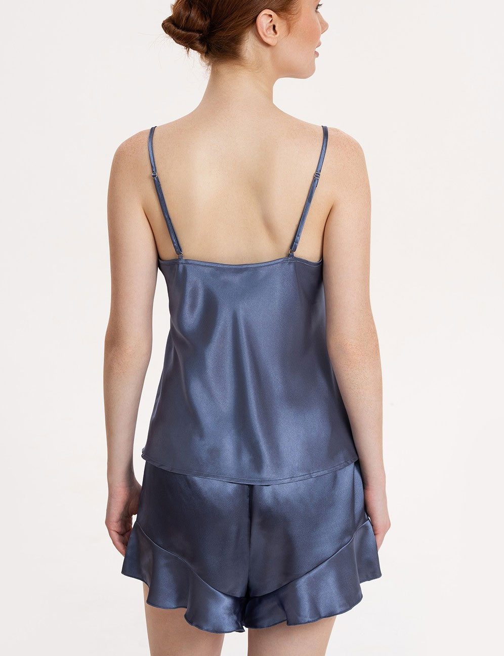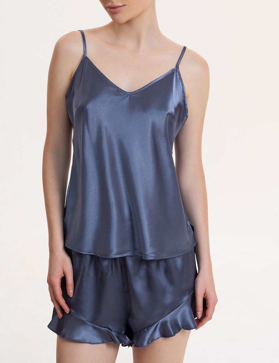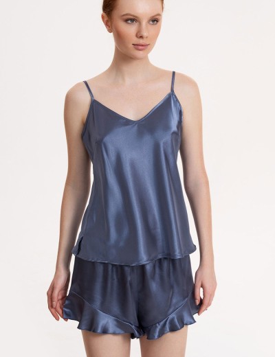Женский комплект для сна Mia-Mella 8754 из коллекции JULIA CHARME — топ на узких бретелях и короткие шортики с рюшами. Цвет «дельфин», мягкий искусственный шелк с атласным блеском создают уют и настроение для сладких снов.