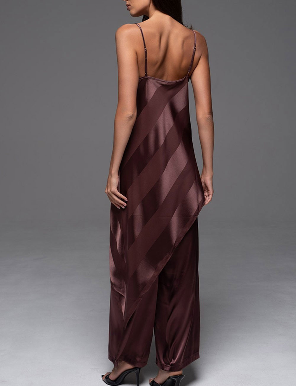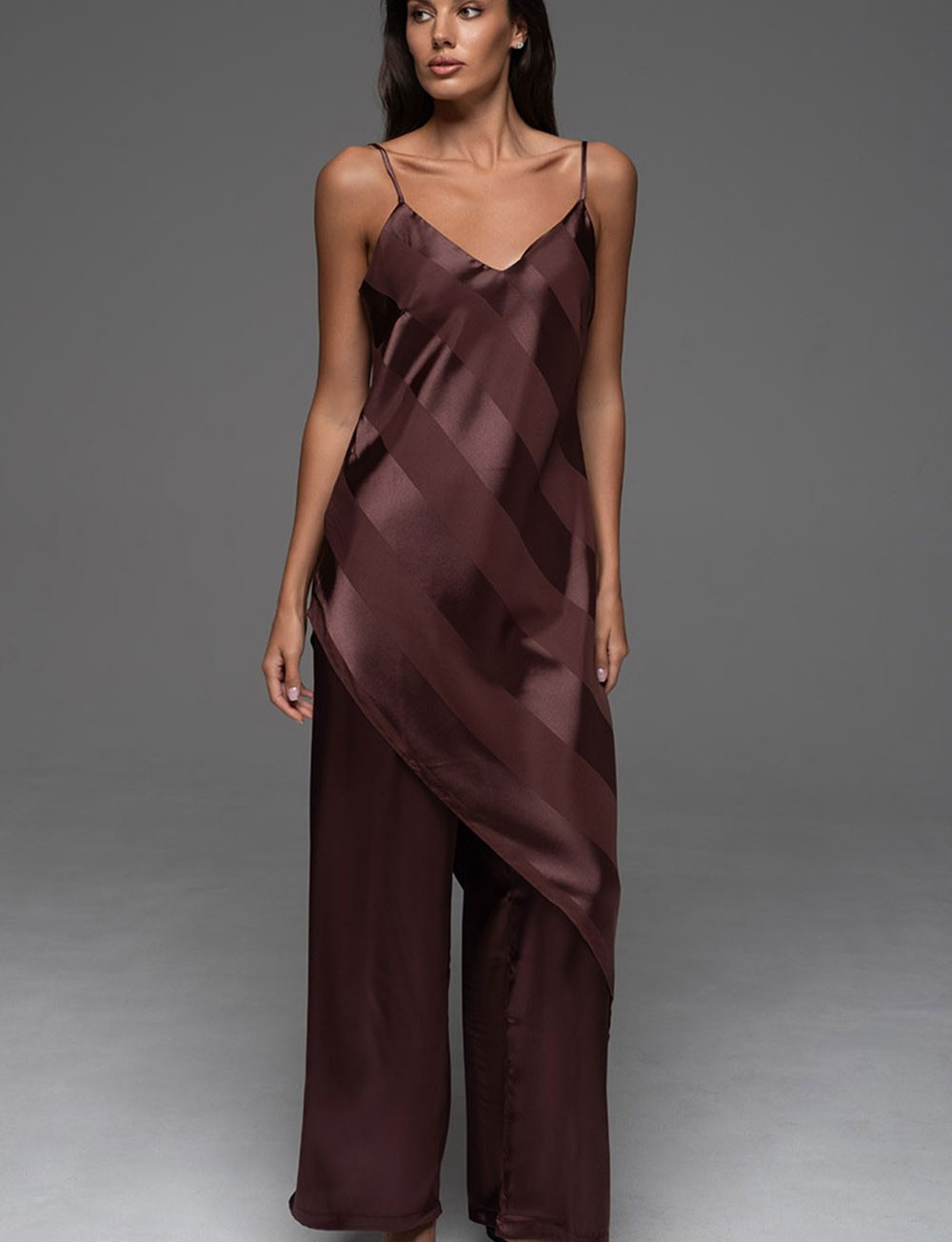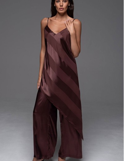Стильный коричневый комплект ILONA 7544 от бренда Mia-Amore включает асимметричный топ на тонких бретелях и широкие брюки палаццо. Топ изготовлен из шёлка-атласа с жаккардовым рисунком, который сочетает широкие глянцевые и матовые полосы, в то время как брюки выполнены из гладкого искусственного шелка, что придает образу интересный небанальный вид.
