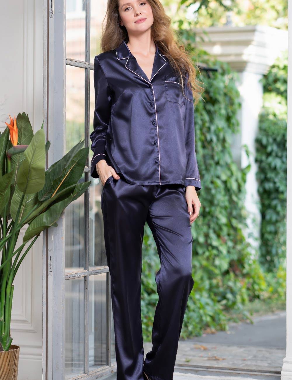 Классическая пижамная пара из коллекции ДЖУЛИЯ глубокого синего цвета из гладкого мягкого шелка-атласа с отделкой тоненьким контрастным кантом.