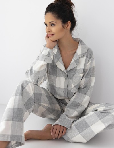 Уютная пижама EVIE польского бренда Sensis выполнена из мягкой хлопковой фланели серой гаммы цветов в крупную клетку. В комплект входят прямые брюки с кулиской на талии и рубашка свободного кроя с длинным рукавом. Выглядит стильно, подходит для домашнего отдыха, создаст ощущение уюта и тепла.