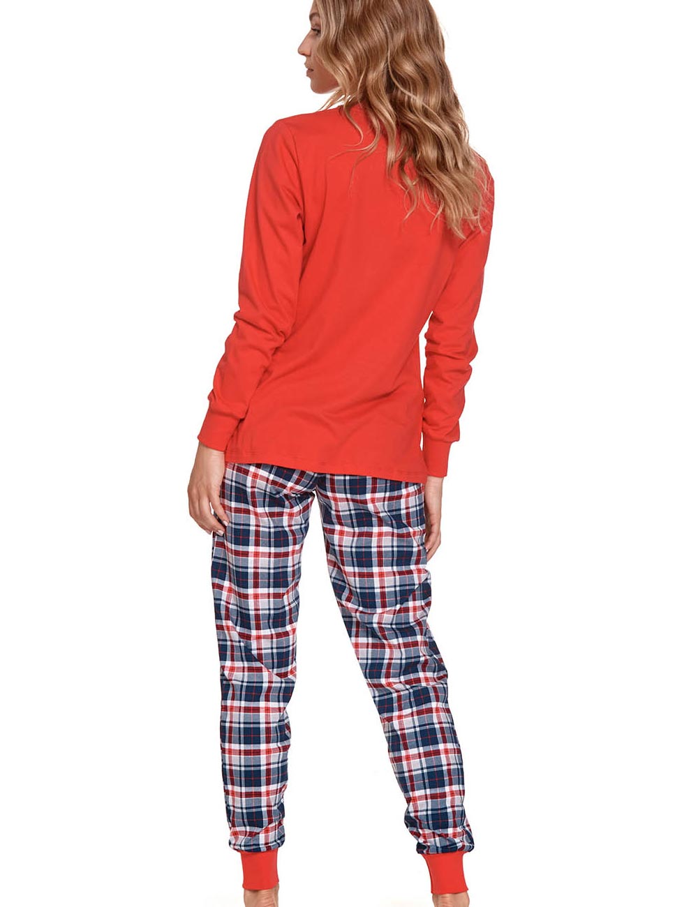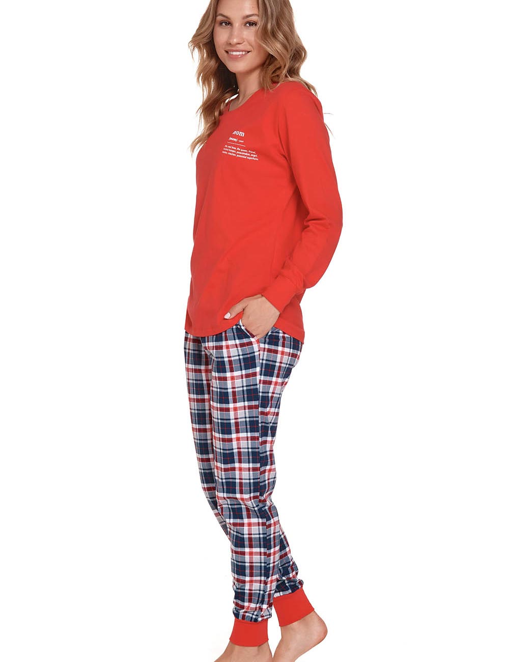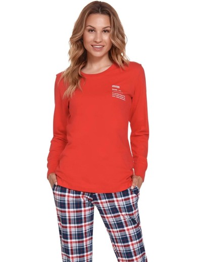 Женский комплект Doctor Nap PM.4322 для сна или отдыха дома, выполнен из высококачественного хлопкового трикотажного полотна. Включает в себя однотонную красную кофту и брюки в клетку.