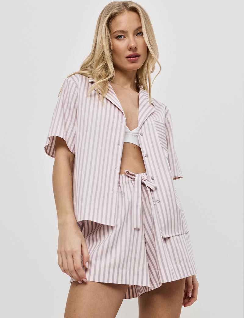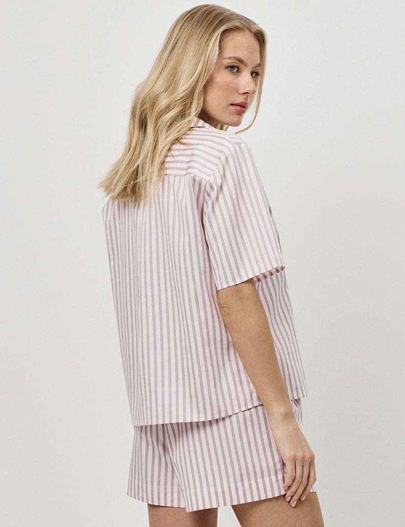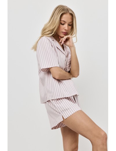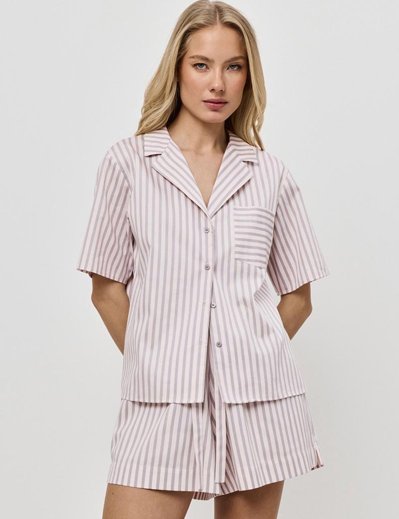 Пижама с шортами ELOW от литовского бренда Aruelle, выполненная в уютной гамме бледно-розовой полоски и капучино, обеспечивает максимальный комфорт и удобство во время ночного отдыха. Выполнена из 100% хлопка с блестящей поверхностью, напоминающей поплиновую ткань. В комплекте рубашка на пуговицах, с короткими рукавами, отложным воротником, нагрудным карманом и шорты свободного кроя, эластичный пояс с кулиской, по бокам карманы.