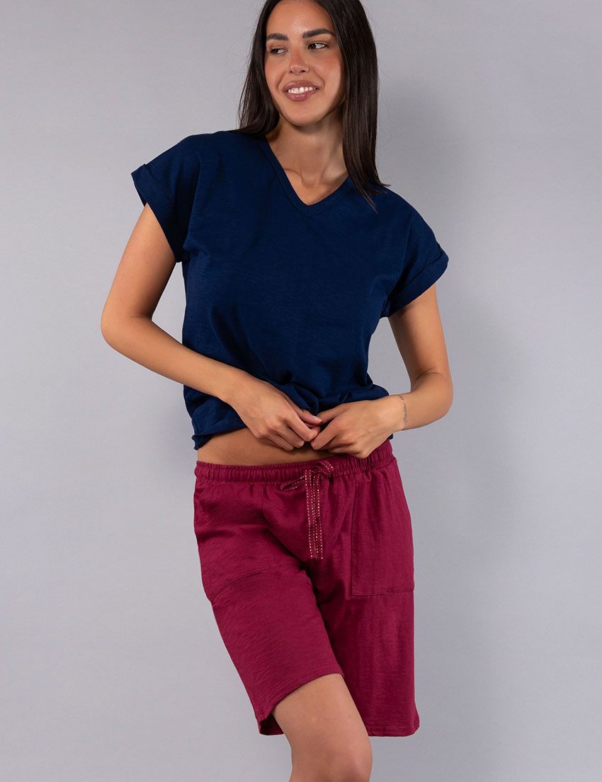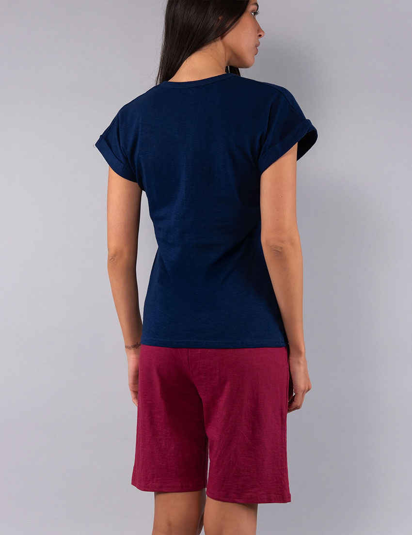 Яркая пижама Sielei CITY CI19 из синей футболки и бордовых удлиненных шорт идеальна для лета. Фактурный меланжевый хлопок с неоднородной структурой дарит приятную прохладу и отлично дышит. Натуральность, пряитная глазу расцветка и мягкая на ощупь ткань обеспечивают исключительный комфорт и уют в теплые вечера.