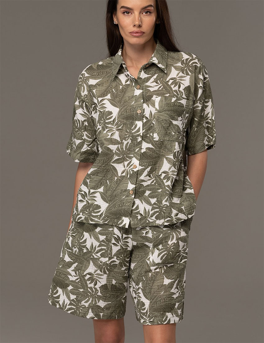 Женский летний комплект AVANTA 5374 от Mia-Amore — хлопковый дуэт из рубашки с коротким рукавом и шорт для тех, кто предпочитает уют в прохладе. Свежий тропический узор и дышащий муслин подарят лёгкость для сна или домашних дел, напоминая, что лето может быть комфортным, даже если термометр шутит злые шутки.