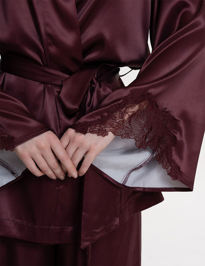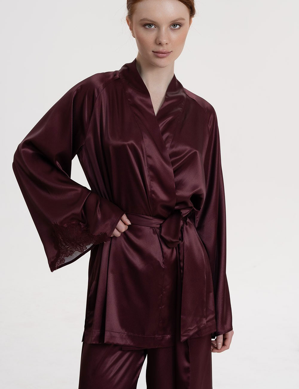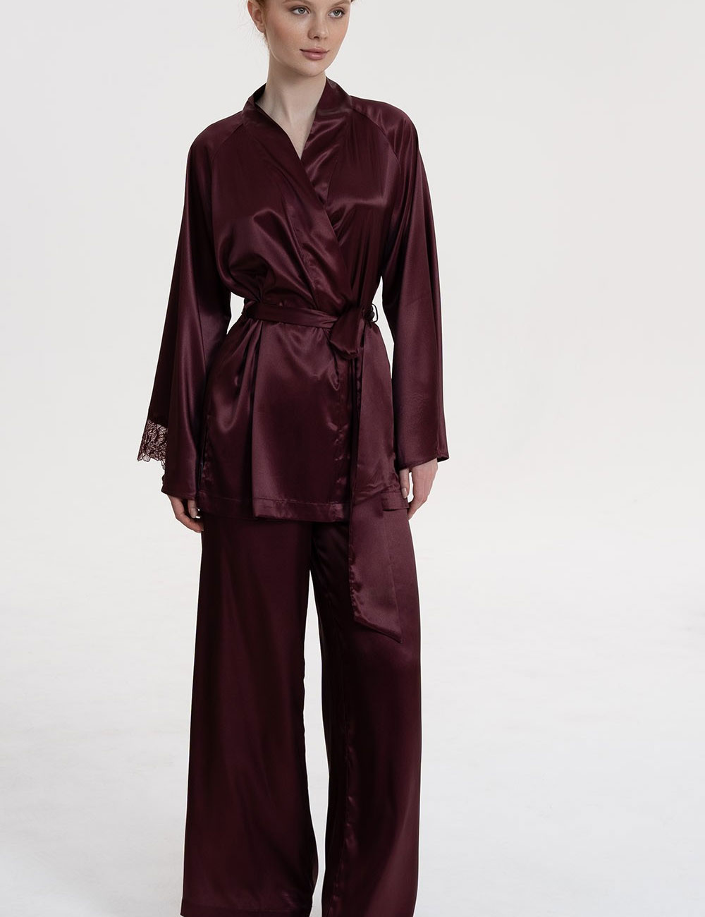 Женская пижама Mia-Amore 4596 из коллекции LILIROSE эффектного винного цвета – запашной жакет с кружевными вставками на рукавах и широкие брюки для максимального комфорта. Сшита из смесового натурального шёлка, дарит ощущение женственности и красоты. Идеальна для тех, кто ценит лёгкую элегантность, помогая расслабиться и насладиться спокойствием ночи.