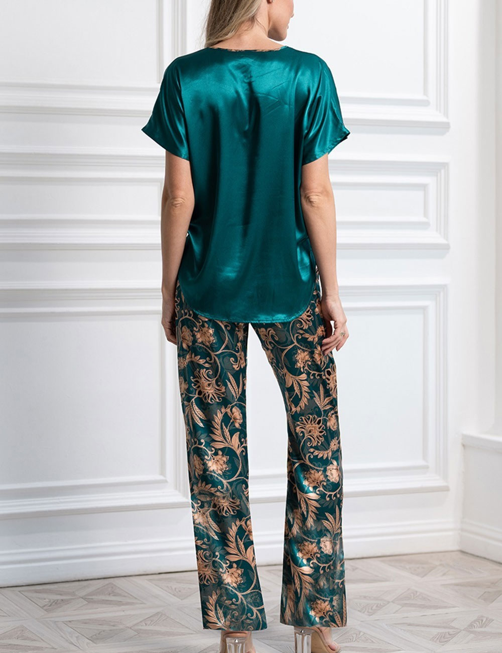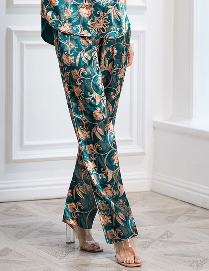 Женская пижама EMERALD 3744 от Mia-Amore из смесового натурального шёлка — это свобода движений и блеск изумруда в каждом шве. Свободный топ и брюки с тонкими лампасами и золотистым принтом создают образ, который хочется носить не только в спальне.