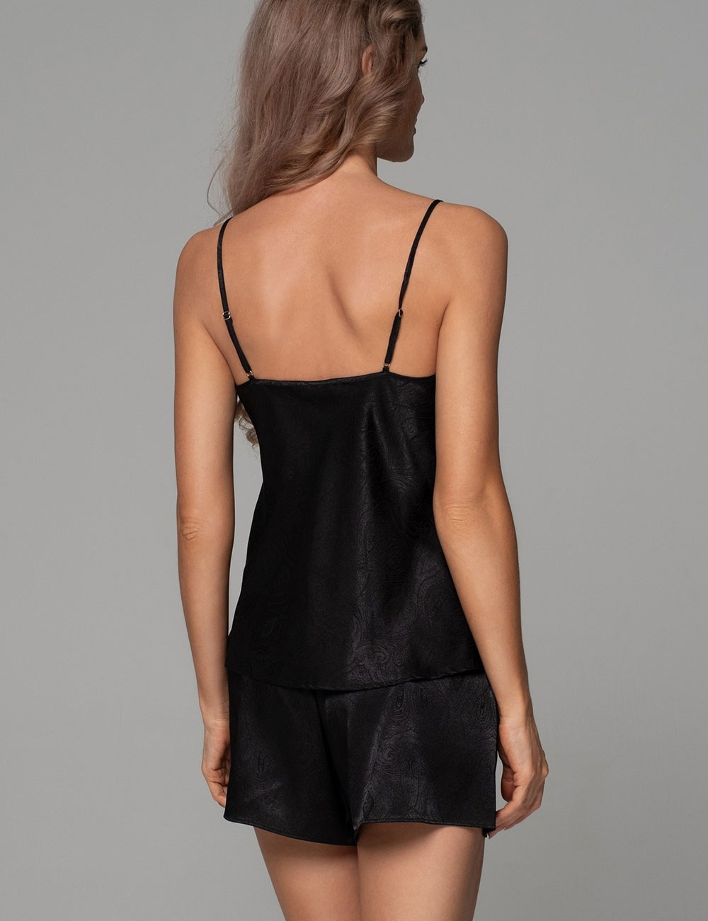 Уютная черная пижама Mia-Amore ANORA модель 4802 из топа и шорт выполнена из смесового натурального шелка с жаккардовым орнаментом. Шелковистая мягкость и гипнотическая игра света обеспечивают невероятный комфорт для ночного отдыха. Создает ощущение роскоши и расслабления, делая каждый вечер особенным.