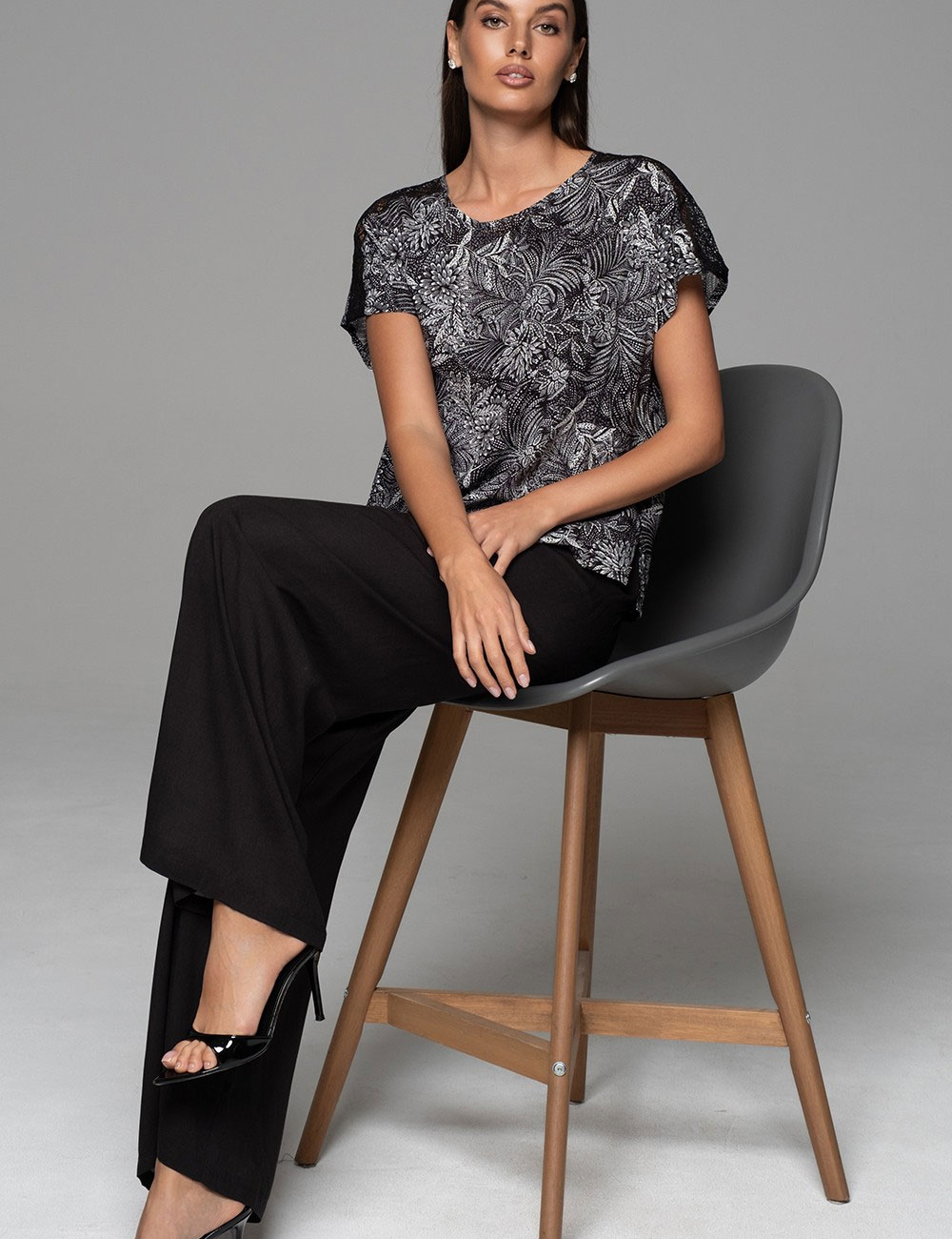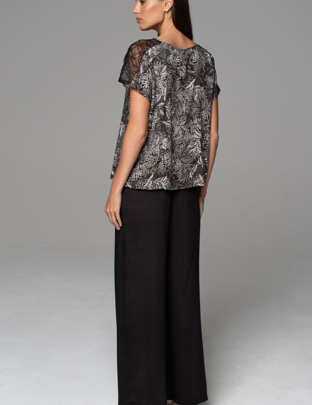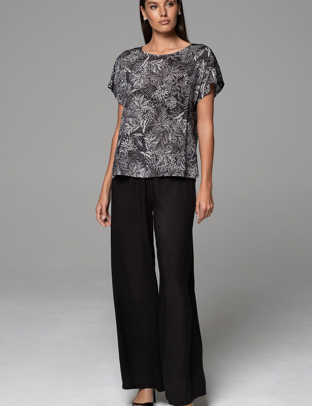 Женский домашний комплект Mia-Amore JOLINE 5586 из дышащей тканой вискозы выглядит стильно и подходит для проведения домашнего досуга, отдыха или сна. Принтованный топ свободного силуэта в угольно-черном цвете гармонирует с широкими однотонными брюками-палаццо, обеспечивая безупречный вид и максимальный комфорт.
