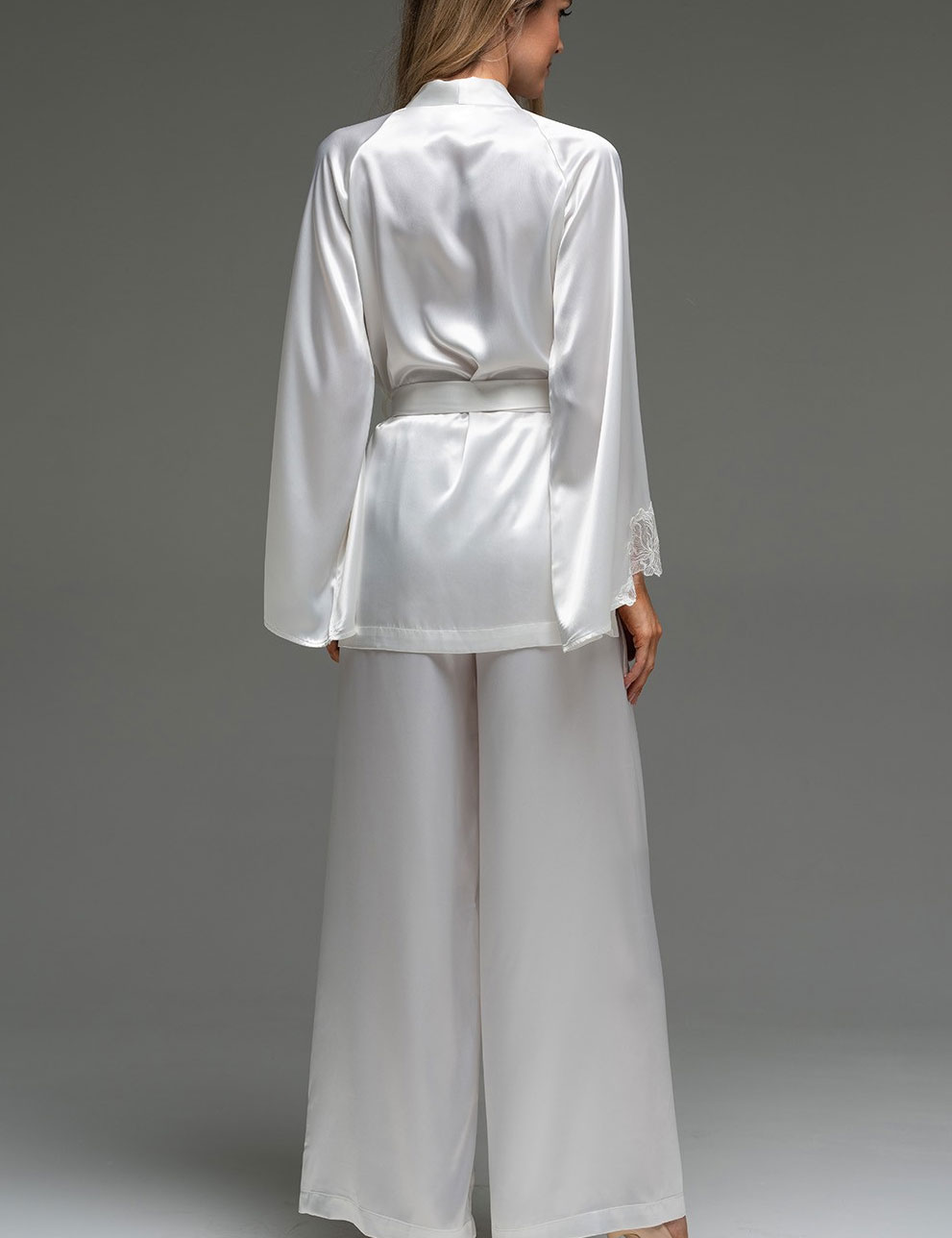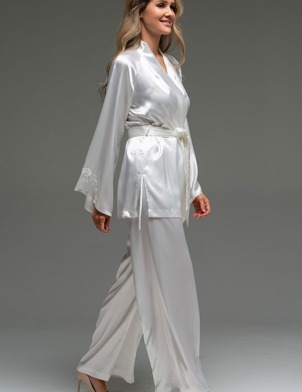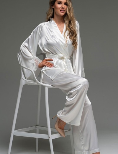 Пижама Mia-Amore LILIROSE модель 4596 — элегантный комфорт для идеальной ночи. Комплект из струящегося смесового шёлка белого цвета: запашной жакет с кружевными рукавами и широкие брюки. Ощутите себя в объятиях невесомой мягкости.