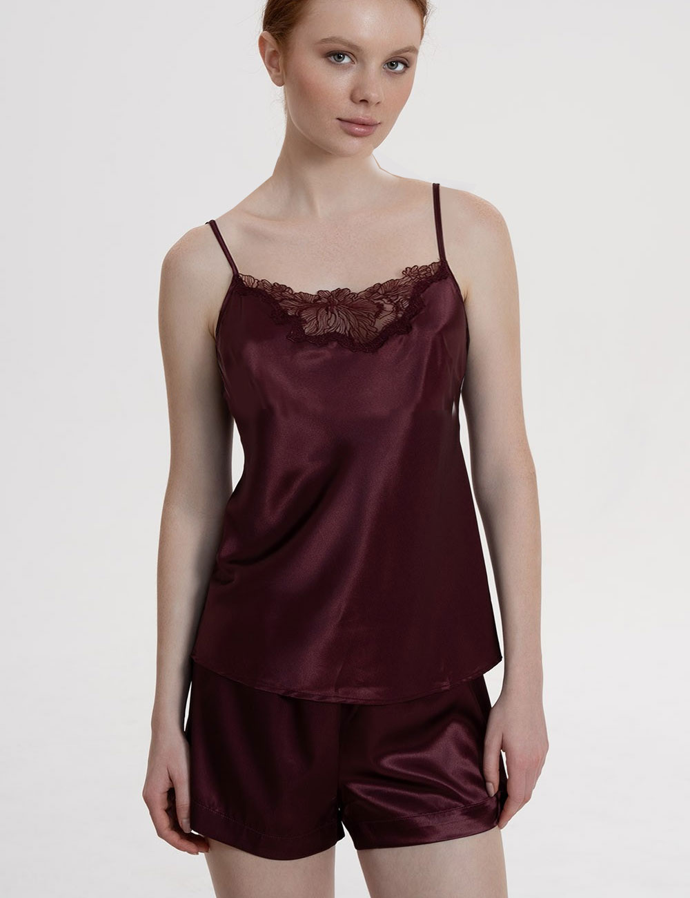 Элегантная пижама женская Mia-Amore 4597 из коллекции LILIROSE – топ и расклешённые шортики из смесового натурального шёлка в глубоком винном цвете с кружевными вставками. Она дарит комфорт и лёгкую игривость вашему утреннему образу. Просыпайтесь с улыбкой, чувствуя себя на все сто.