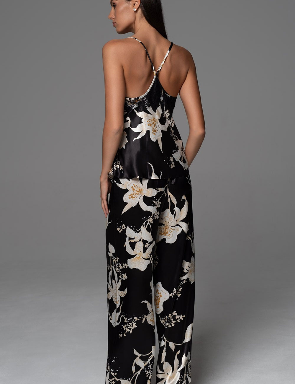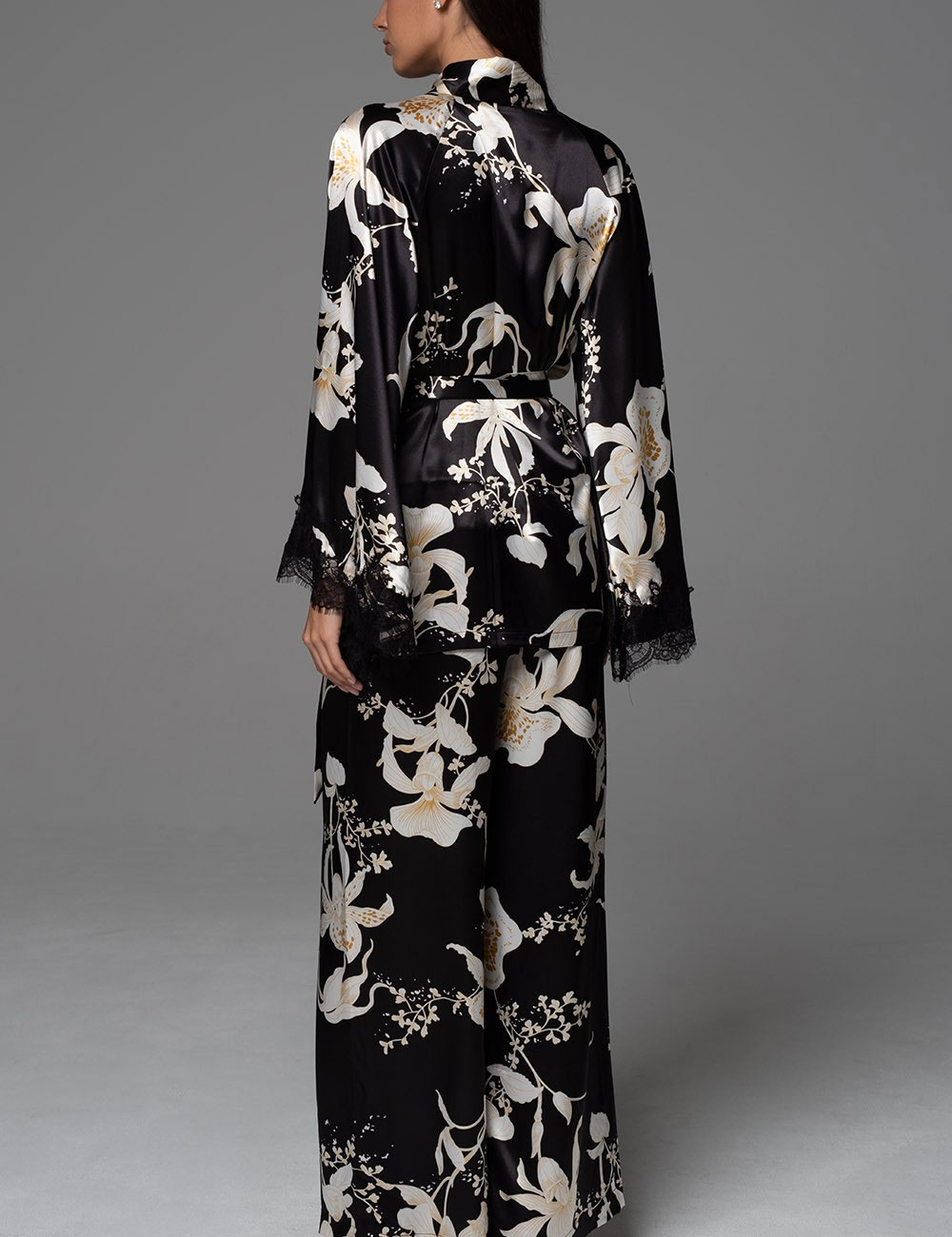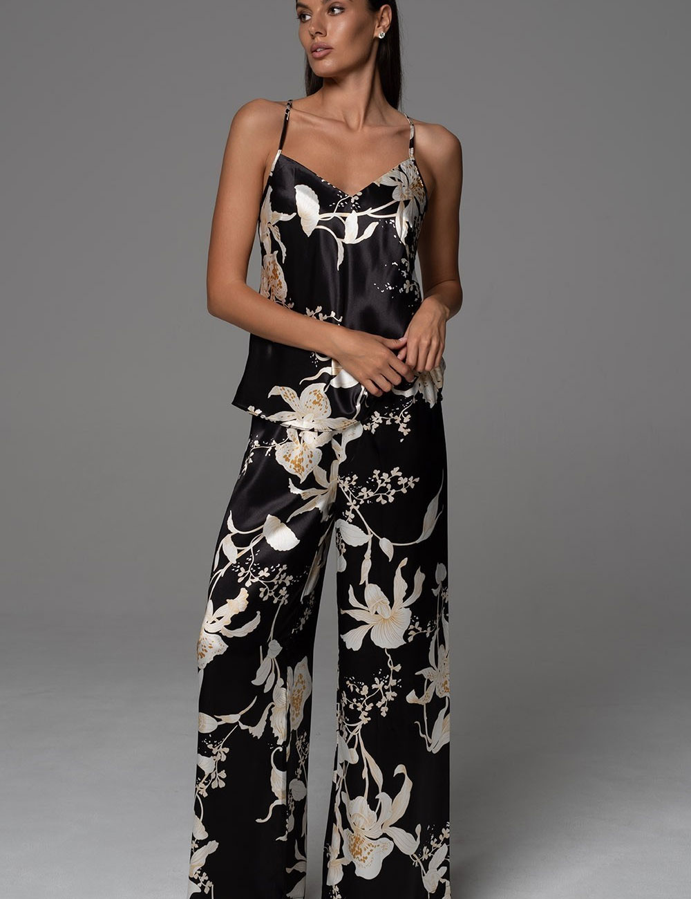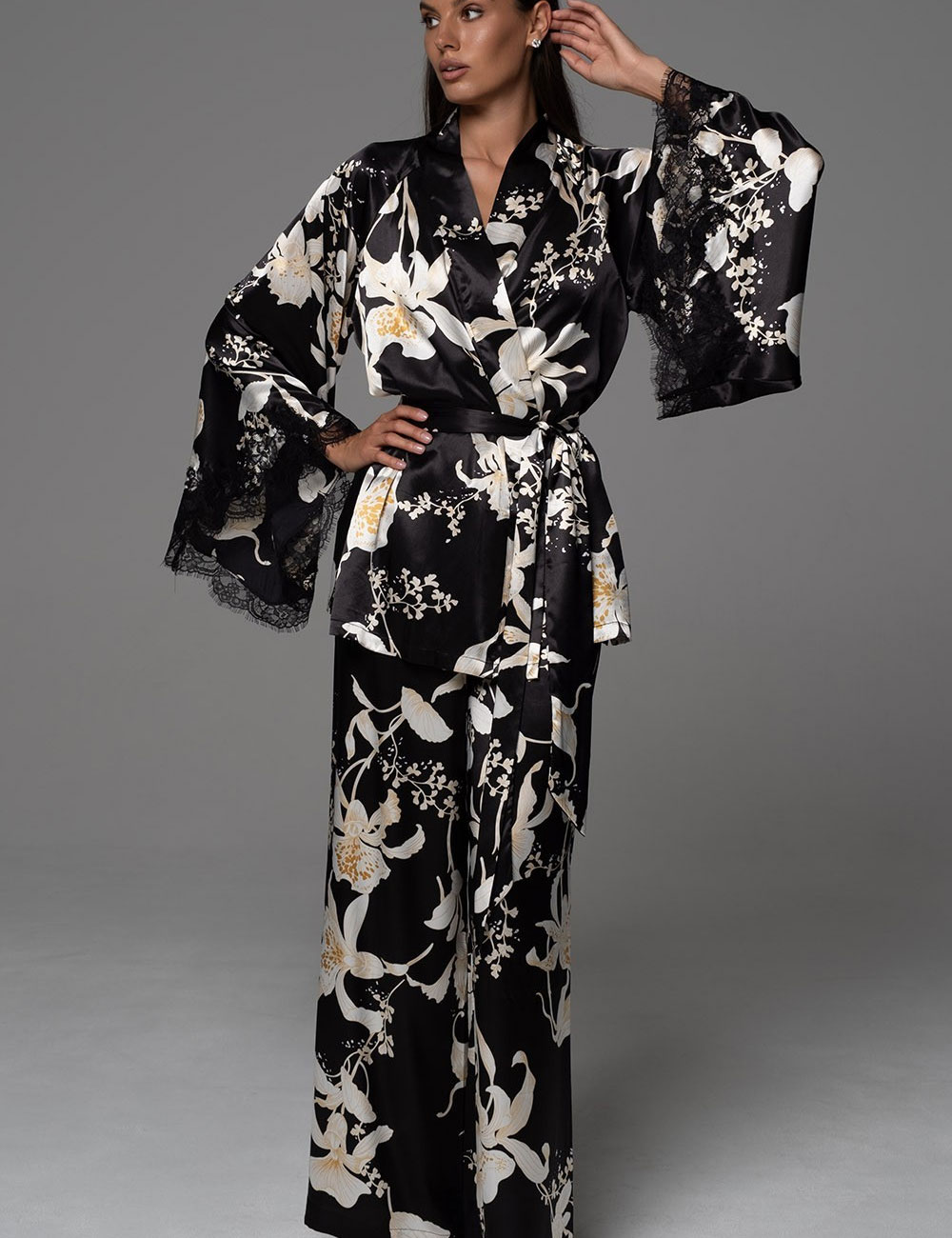 Комплект-тройка Mia-Amore 4776 из коллекции ARABEL — это элегантный запашной жакет, лёгкий оригинальный топ и свободные брюки-палаццо, созданные для идеального домашнего уюта. Натуральный смесовый шёлк чёрного цвета с белым контурным принтом орхидей дарит ощущение нежной роскоши, а кружевные акценты подчёркивают утончённую чистоту и гармонию женщины.