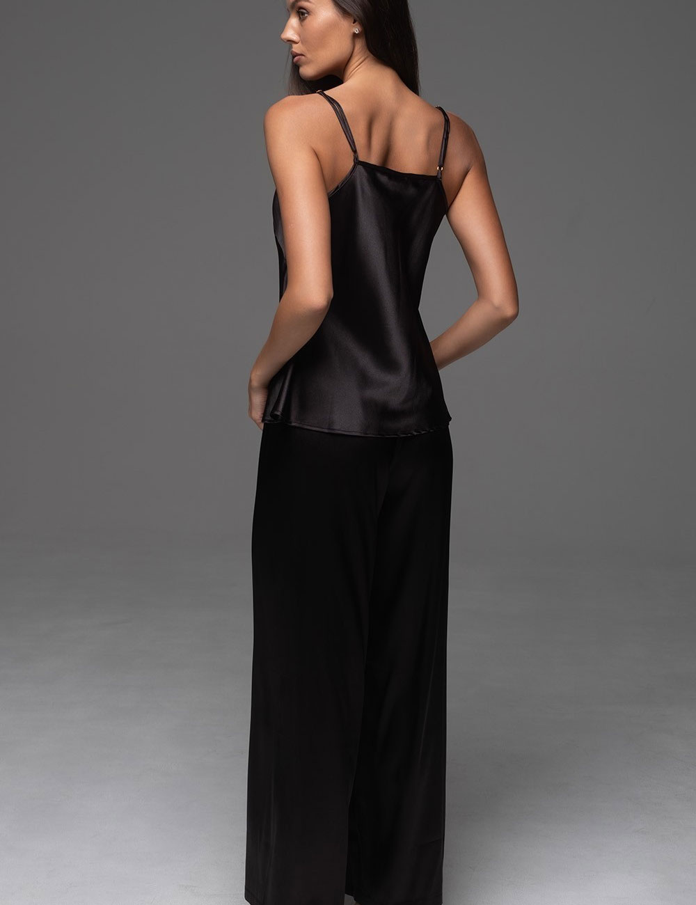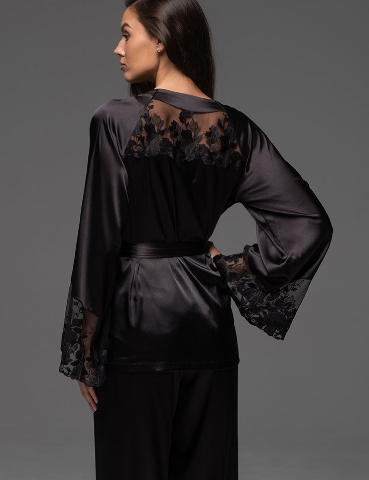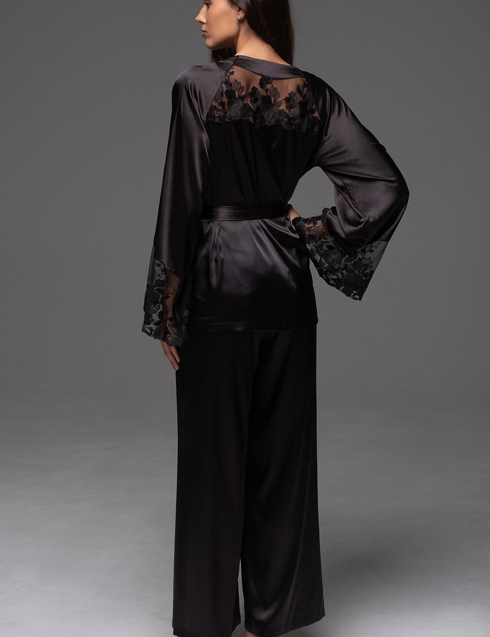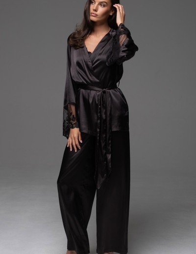 Пижама-тройка Mia-Amore 4746 из коллекции MERLOT — топ на бретелях, широкие брюки-палаццо и запашной жакет с длинными рукавами из смесового натурального шёлка с кружевными вставками — настоящий гимн женственности и элегантности. Глубокий чёрный цвет подчёркивает статус и создаёт поистине королевский образ для особых случаев.