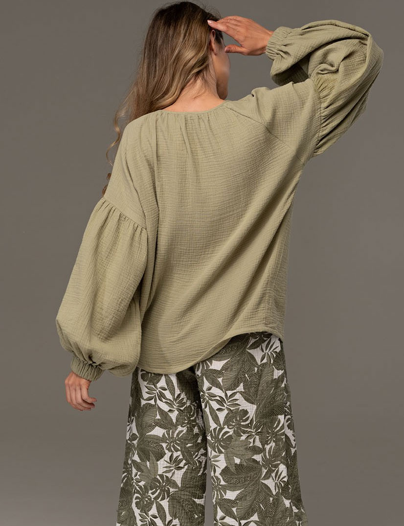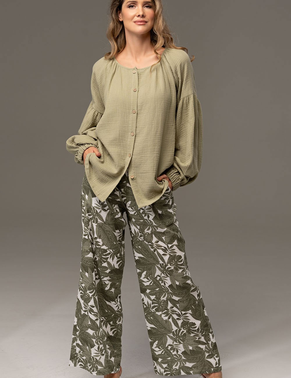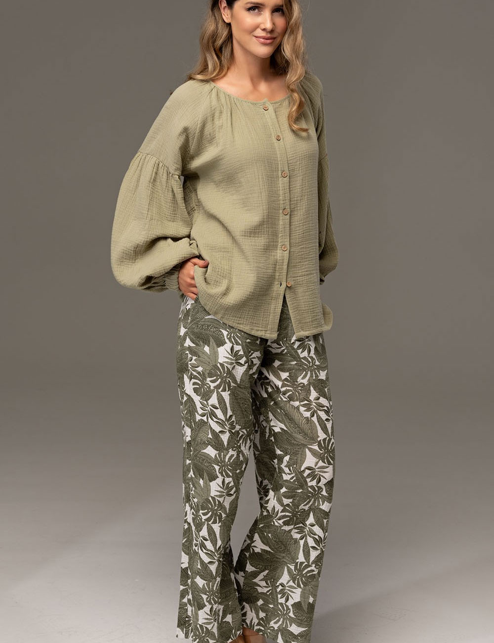 Комплект AVANTA 5376 от Mia-Amore: мягкая хлопковая муслиновая блуза свободного кроя и широкие принтованные брюки в нежном оливковом цвете. Лёгкость, дышащая натуральная ткань и уютный силуэт — идеально для прогулок, отдыха и домашнего комфорта.