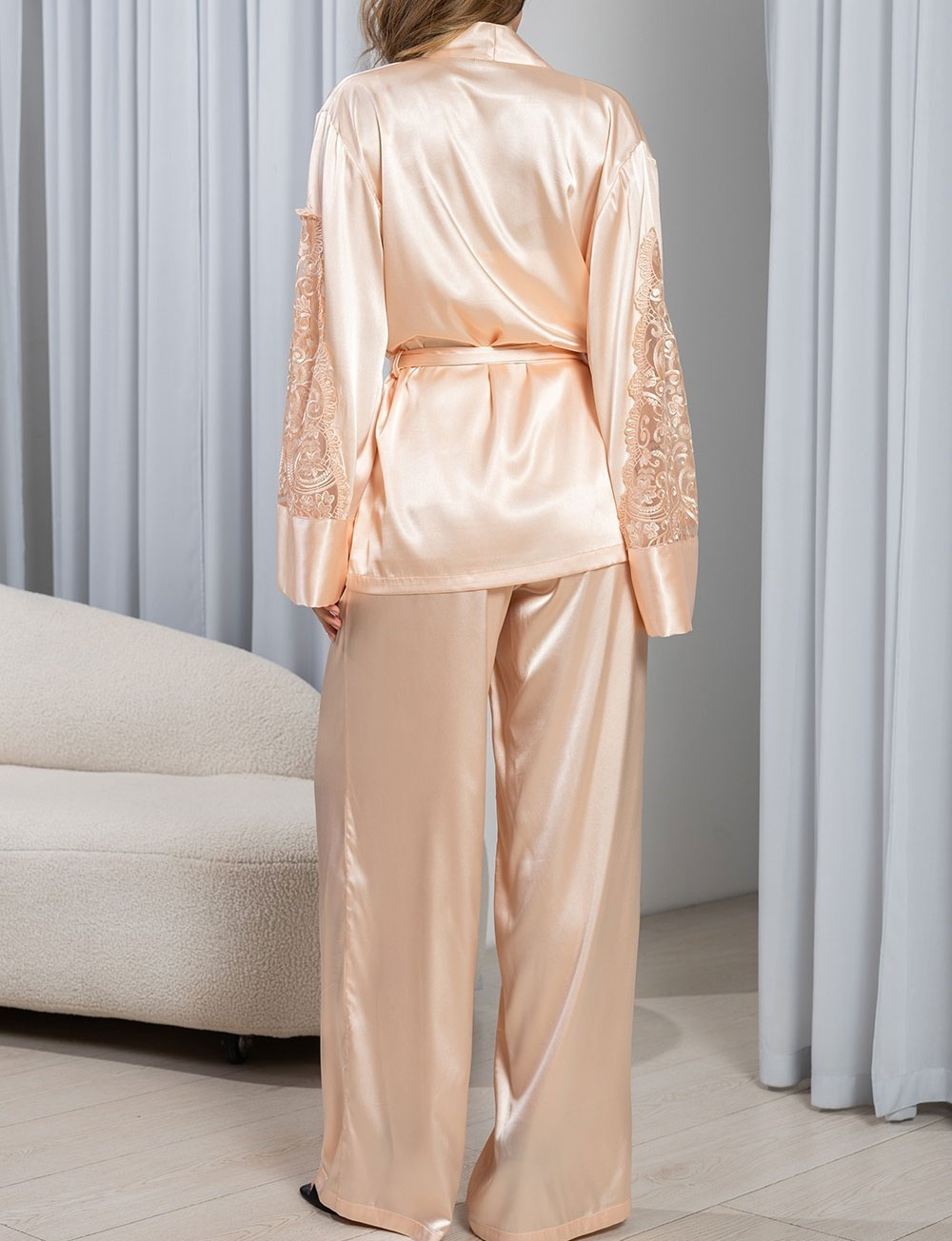 Комплект MARJORY 3966 от Mia‑Amore – итальянская тройка из струящегося смесового шёлка нежного персикового оттенка, украшен кружевными элементами. Широкие брюки‑палаццо, топ на бретелях и запашной жакет создают утончённый домашний образ, идеальный для любого сезона. Лёгкая ткань позволяет свободно двигаться, а дизайн подходит как для отдыха, так и для романтических вечеров.
