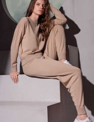 Костюм Lormar FEELING 604183LU в оттенке gold rose выполнен из мягкого вискозного полотна с деликатными люрексовыми акцентами. Кофта свободного кроя и брюки на манжетах обеспечивают комфортную посадку и полную свободу движений. Однотонная гладкая вязка приятна телу, что делает этот комплект идеальным решением для уютного отдыха или стильных повседневных прогулок.