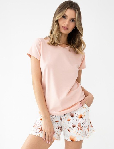 Женская пижама Sensis ARIELLE состоит из однотонной футболки и шортиков с цветочным принтом.