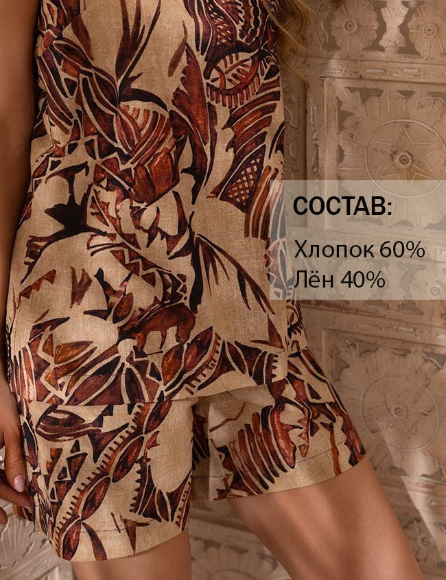 Комплект для летнего отдыха EPHIOPIA 5454 от бренда Mia-Amore включает топ на широких бретелях и стильные шорты. Изготовлен из легкой смесовой ткани с хлопком и льном, этот натуральный материал обеспечивает комфорт как на пляже, так и дома, подчеркивая фигуру и становясь универсальным выбором для расслабленного времяпрепровождения в любое время.