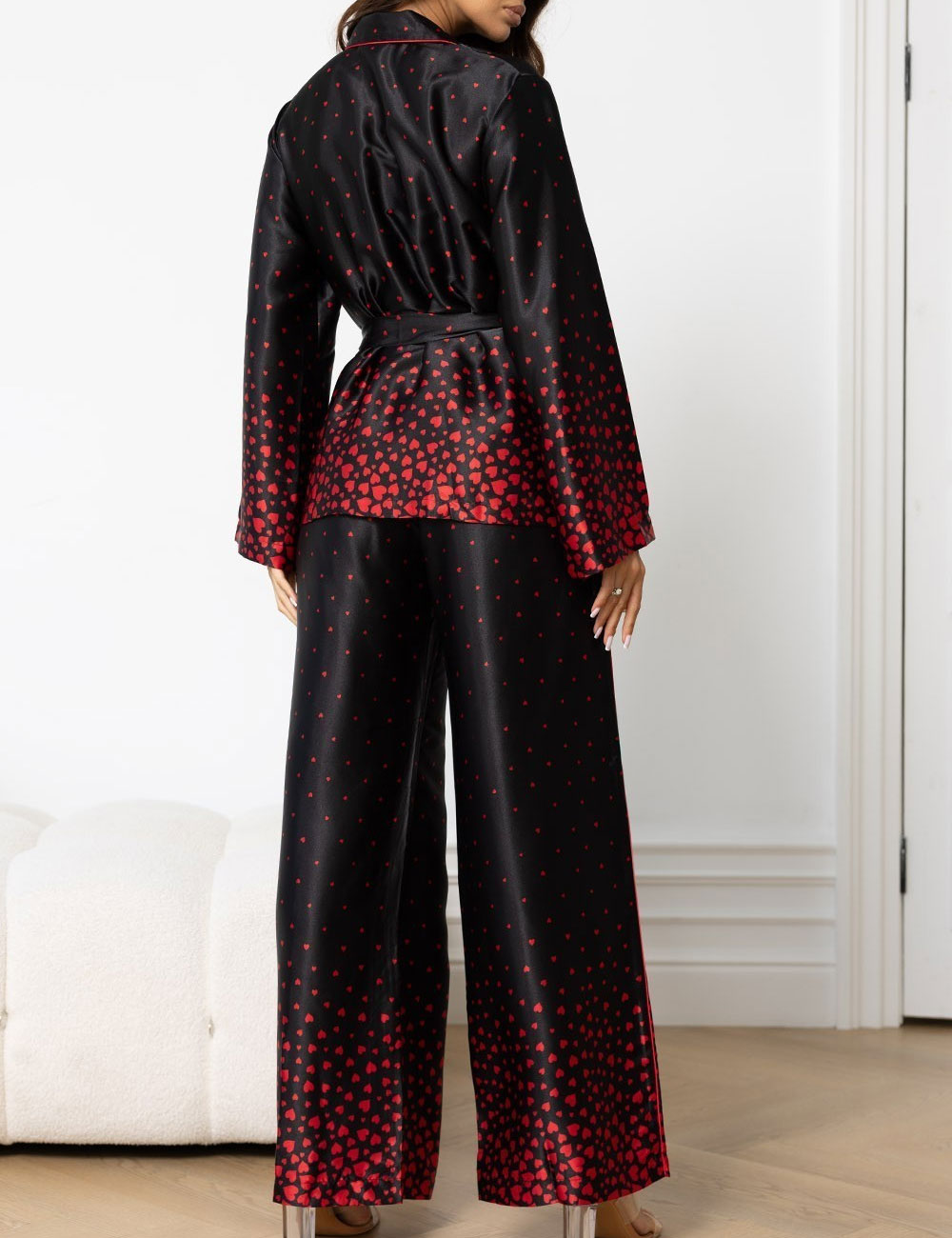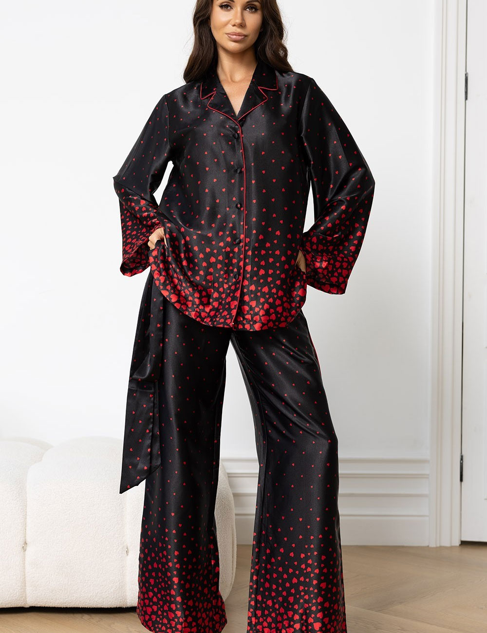 Пижама Mia-Amore NOEMI модель 2325 — уютный комплект из брюк и жакета на пуговицах с широким съемным поясом. Сшита из шелковистого атласа с принтом красных сердечек на черном фоне. Воплощает флирт и молодость: создай атмосферу любви в спальне или стань звездой задорных пижамных вечеринок. Идеально для признания в любви к себе — с улыбкой и шармом!