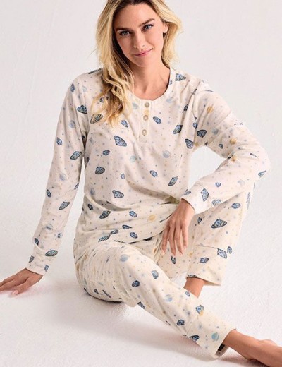 Мягкая молочная пижама SPACE TRIP SPC2844 от Infiore — теплый флис, словно утренний туман, и галактики с летающими тарелками, плывущие, будто мечты в ночном небе. Кофта с длинным рукавом, брюки с манжетами — тепло и покой каждой ночью.