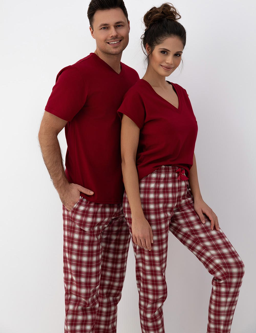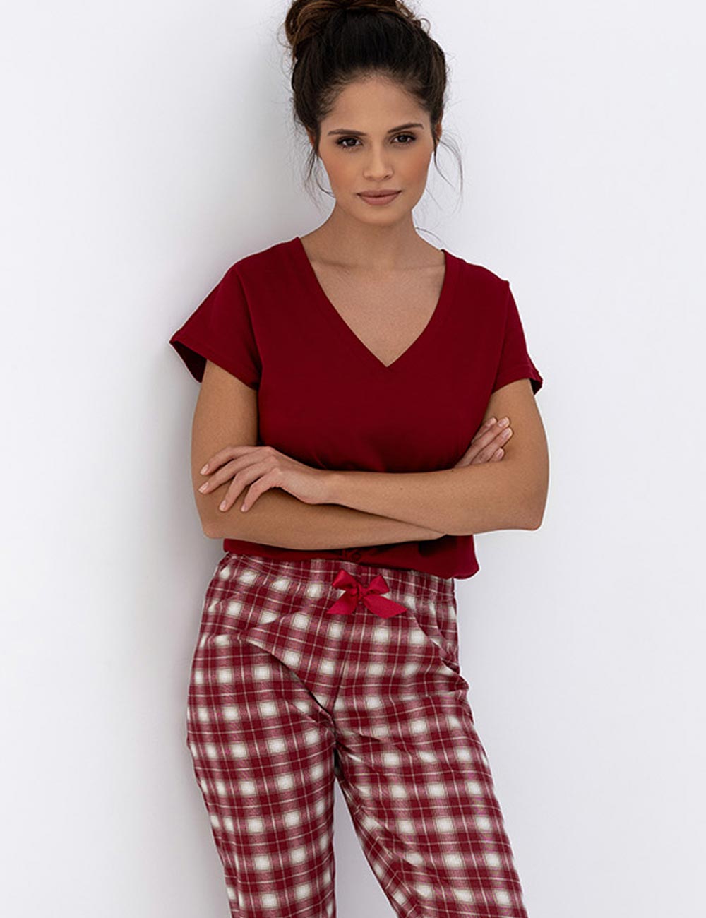 Женская пижама из хлопка ALIVIA от польского бренда Sensis состоит из однотонной темно-красной футболки и брюк с крупной клеткой. Это идеальный выбор для создания праздничного настроения и ощущения уюта в зимний период.