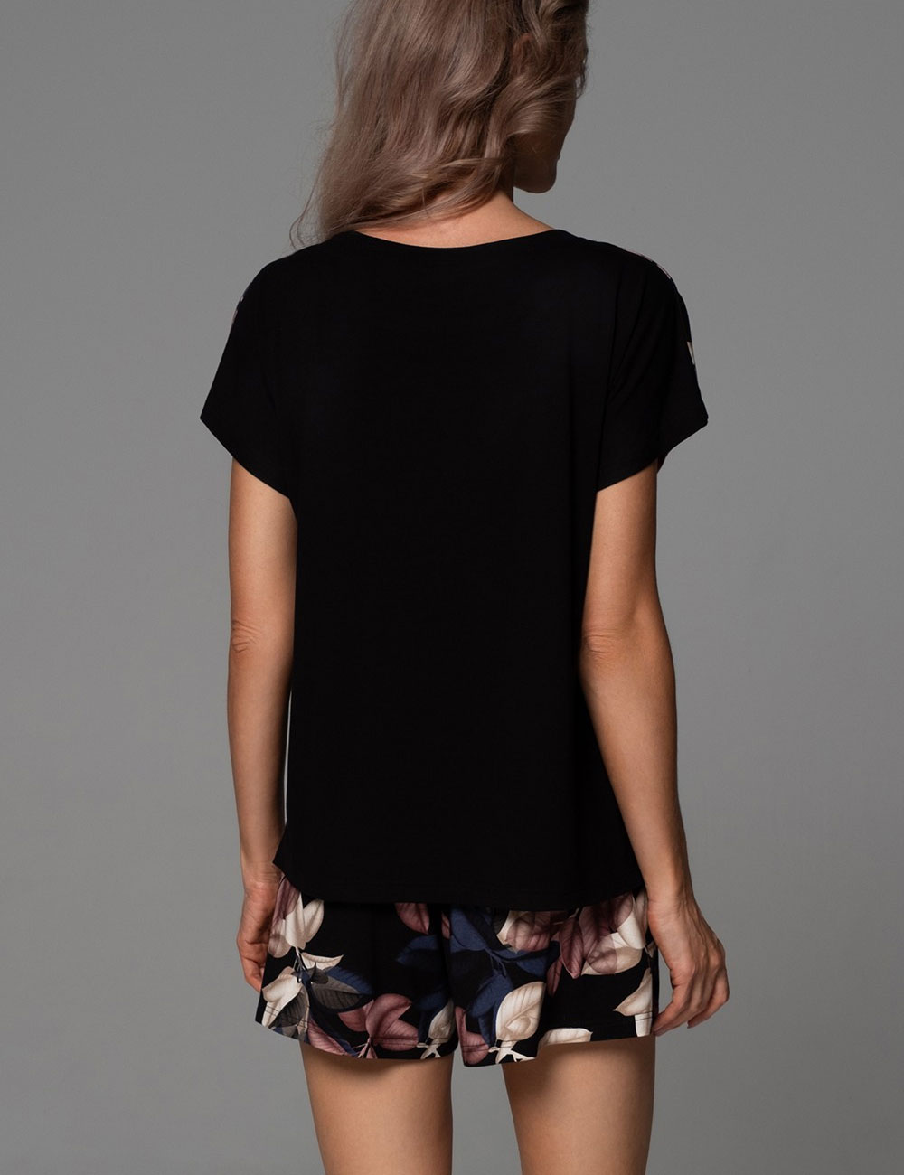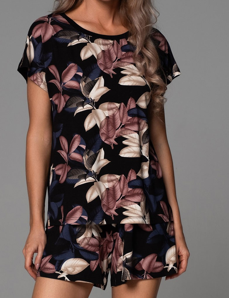 Идеальная пижама Mia-Amore 5572 из коллекции DAIANA для тех ночей, когда хочется забыть о целом мире и погрузиться в сладкий сон: свободный топ с коротким рукавом и удобные шорты из мягкого вискозного трикотажа с живым растительным принтом и черной отделкой. Дышащая натуральная ткань заботится о вашей коже всю ночь.