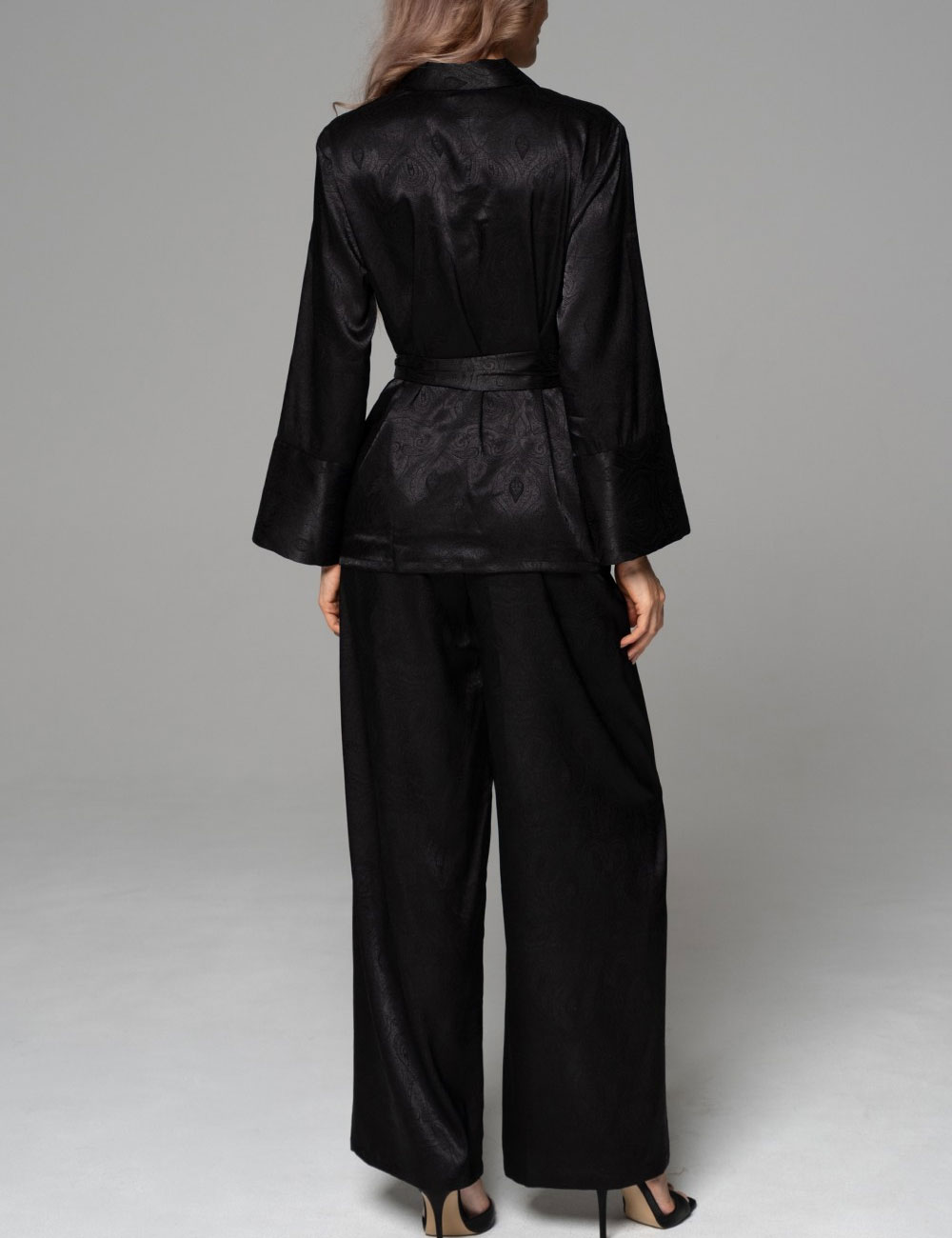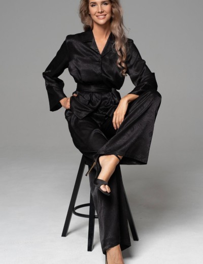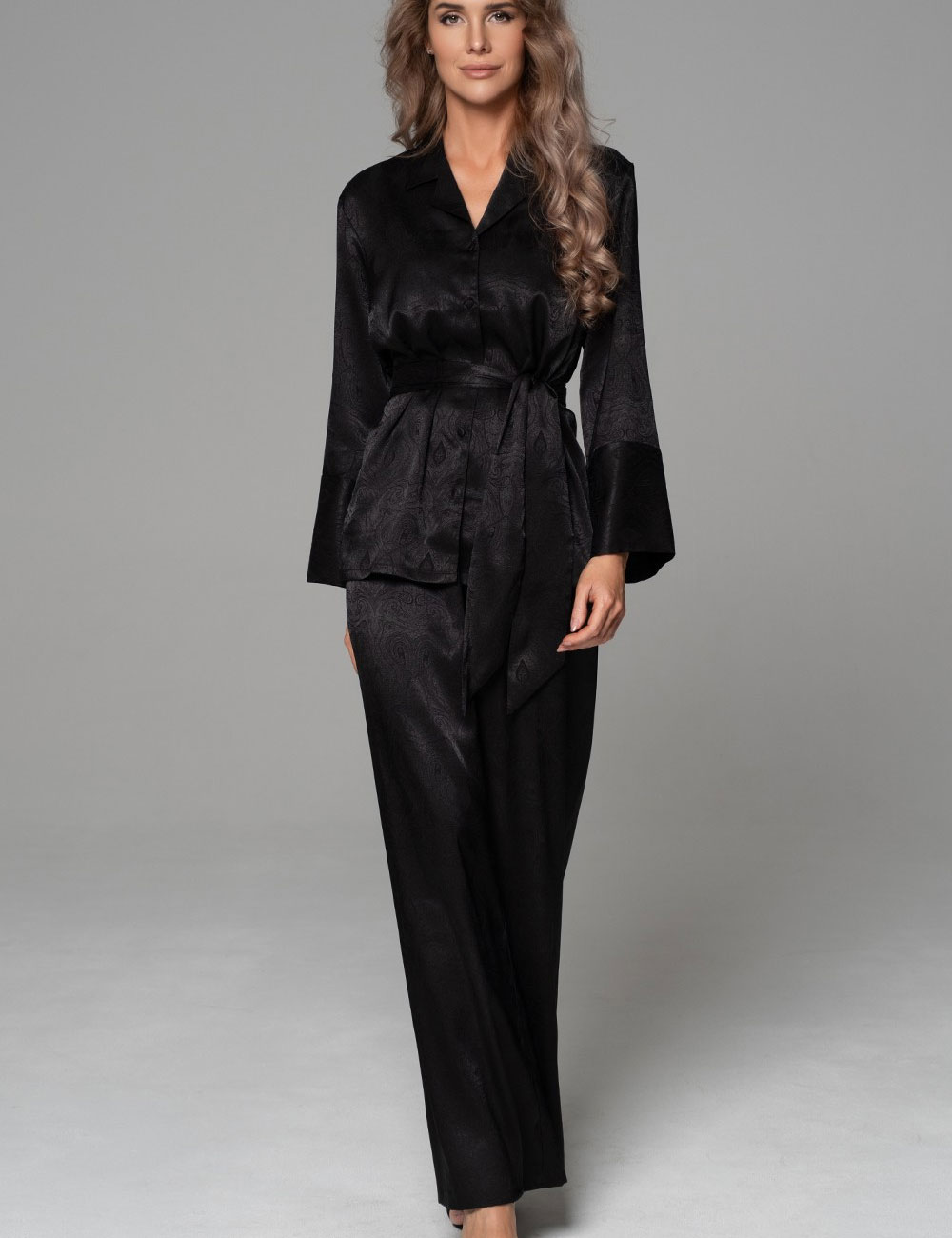 Классическая пижама ANORA 4806 от Mia-Amore в черном цвете, с жакетом и широкими брюками. Изготовлена из смесового натурального шелка с завораживающим жаккардовым узором. Игра света на ткани дарит ощущение магии, а невероятная мягкость обеспечивает комфорт на всю ночь.