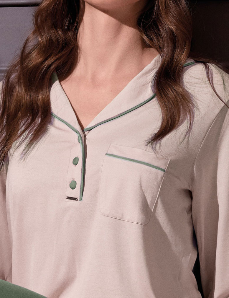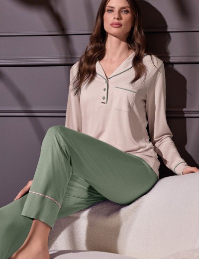 Пижама-поло Lormar TODAY 654099LU champagne/oliva из мягкой вискозы сочетает уют и стиль. Топ с длинными рукавами и брюки дополнены изящными окантовками в нежной палитре. Лаконичный крой в духе журнальной моды создает элегантный образ для отдыха, обеспечивая телу легкость и приятные тактильные ощущения.