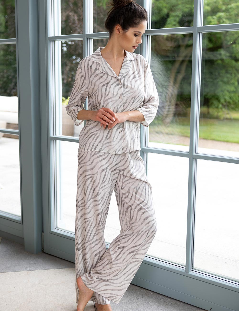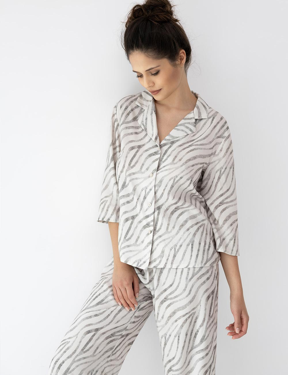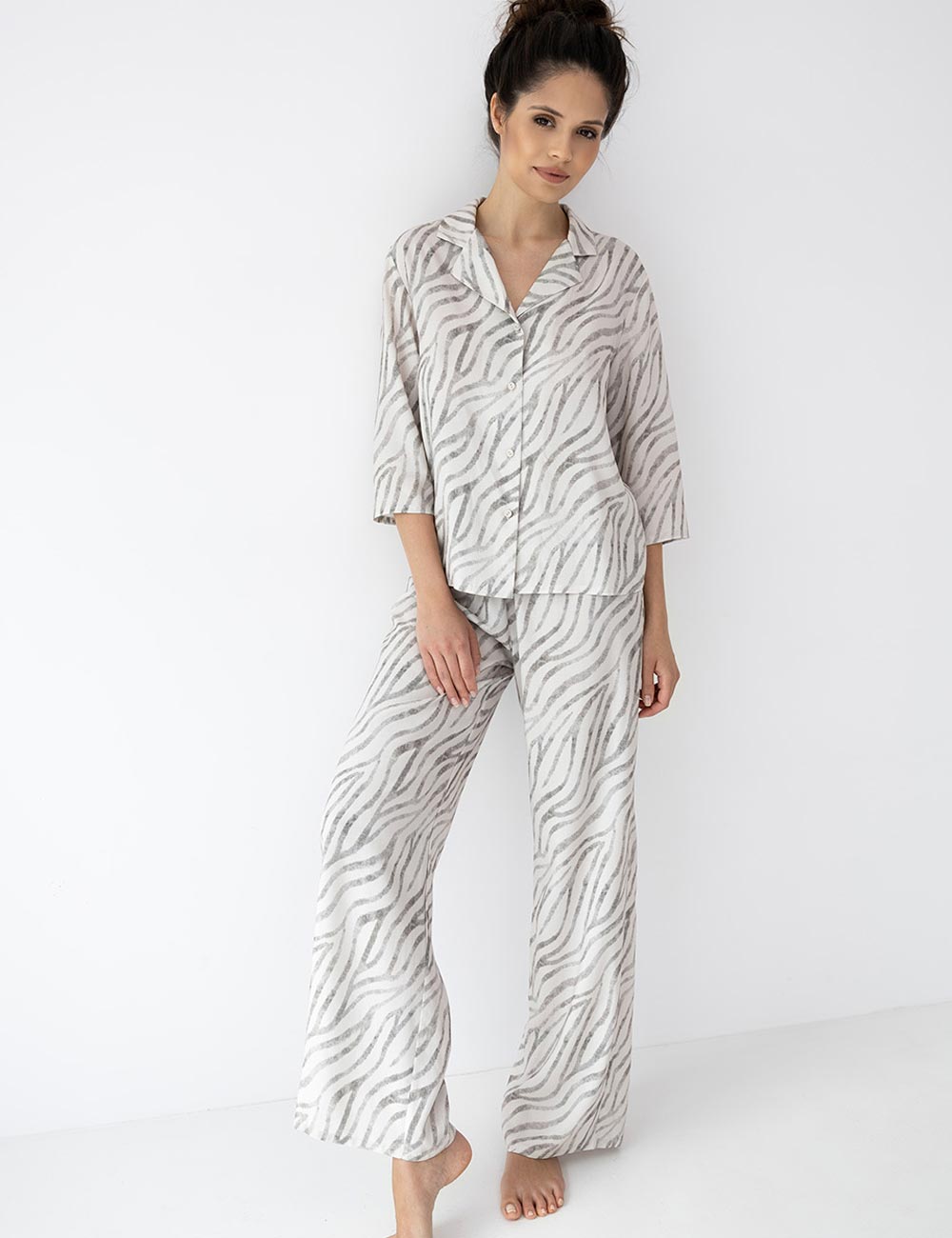 Лёгкий пижамный комплект Sensis EMORY включает в себя рубашку и брюки. Выполнен из мягкой принтованной вискозы, классический крой позволяет носить его как стильную домашнюю одежду.