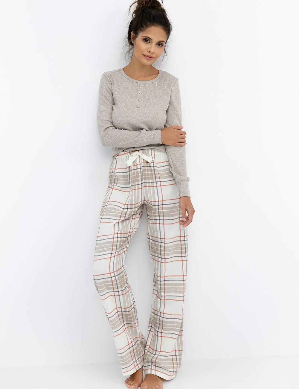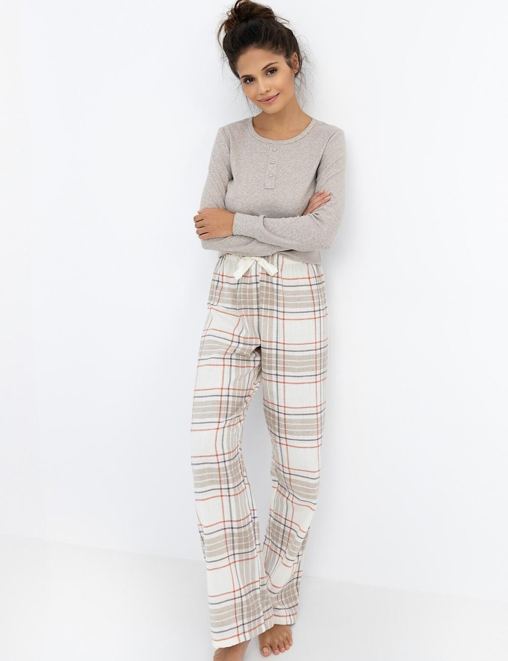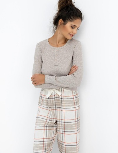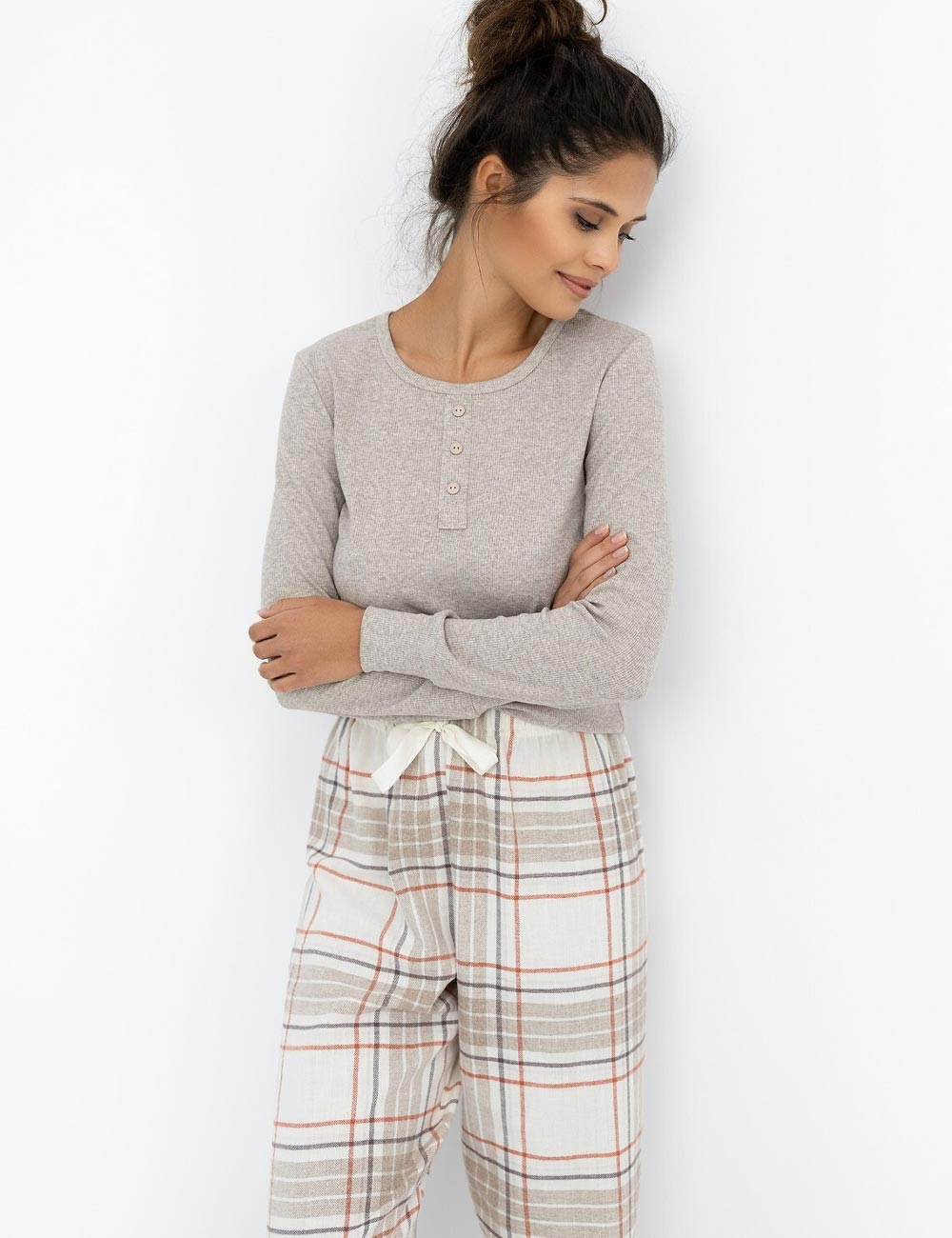 Женская пижама ANGELINA от польского бренда Sensis в бежевой гамме цветов, включает в себя однотонный лонгслив из мягкой хлопковой ткани в рубчик и фланелевые брючки в клетку.