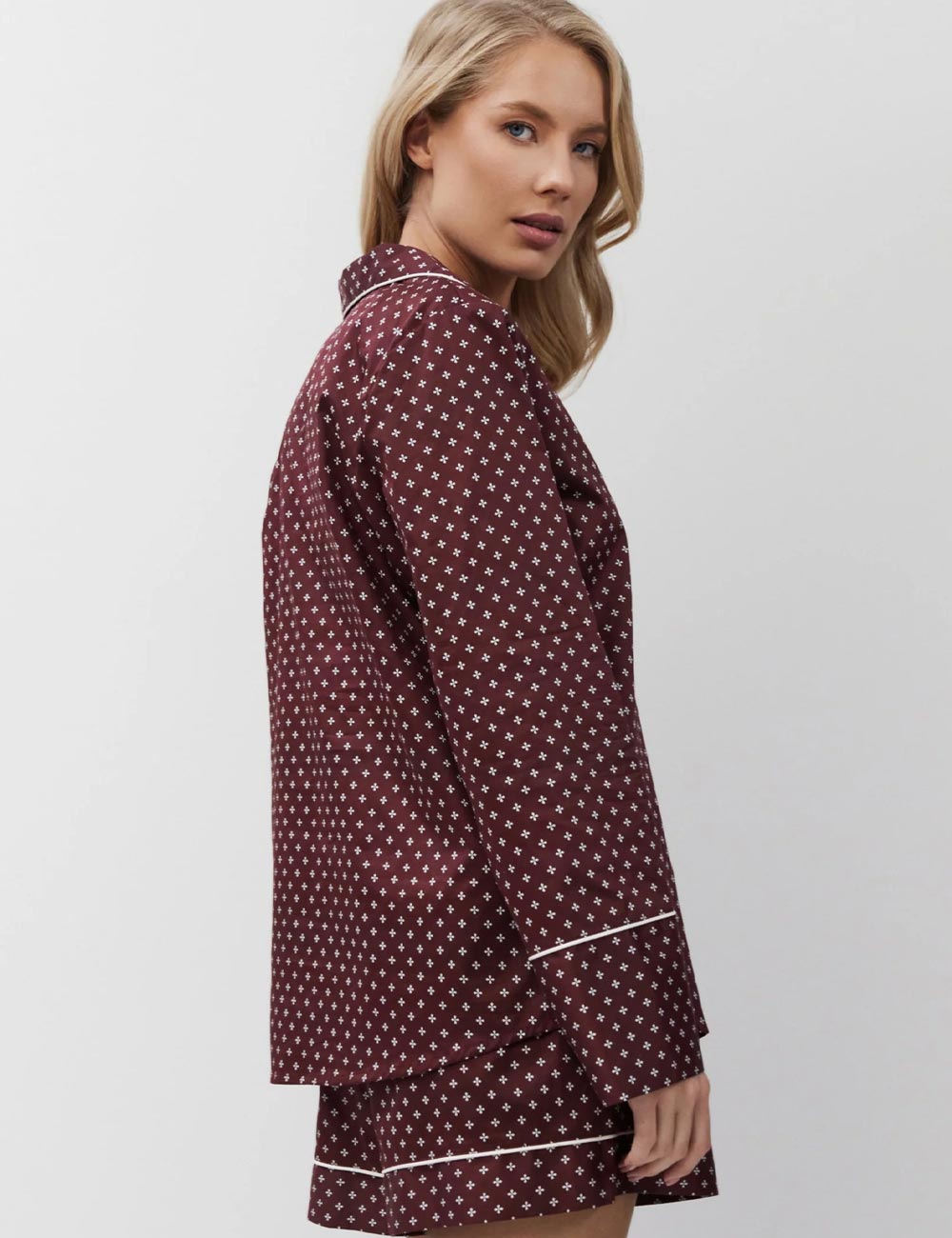 Стильная хлопковая пижама GEORGETTE от литовского бренда Aruelle в бордовой расцветке с принтом и контрастной окантовкой. Кокетливые шортики с боковыми карманами эффектно сочетаются с элегантной рубашкой.