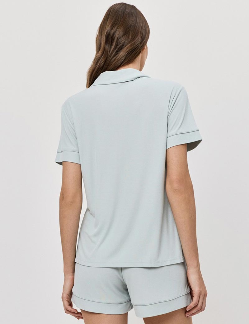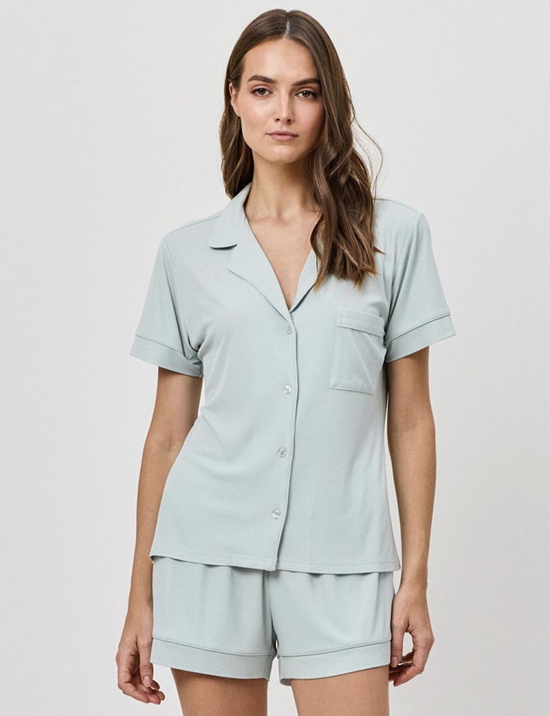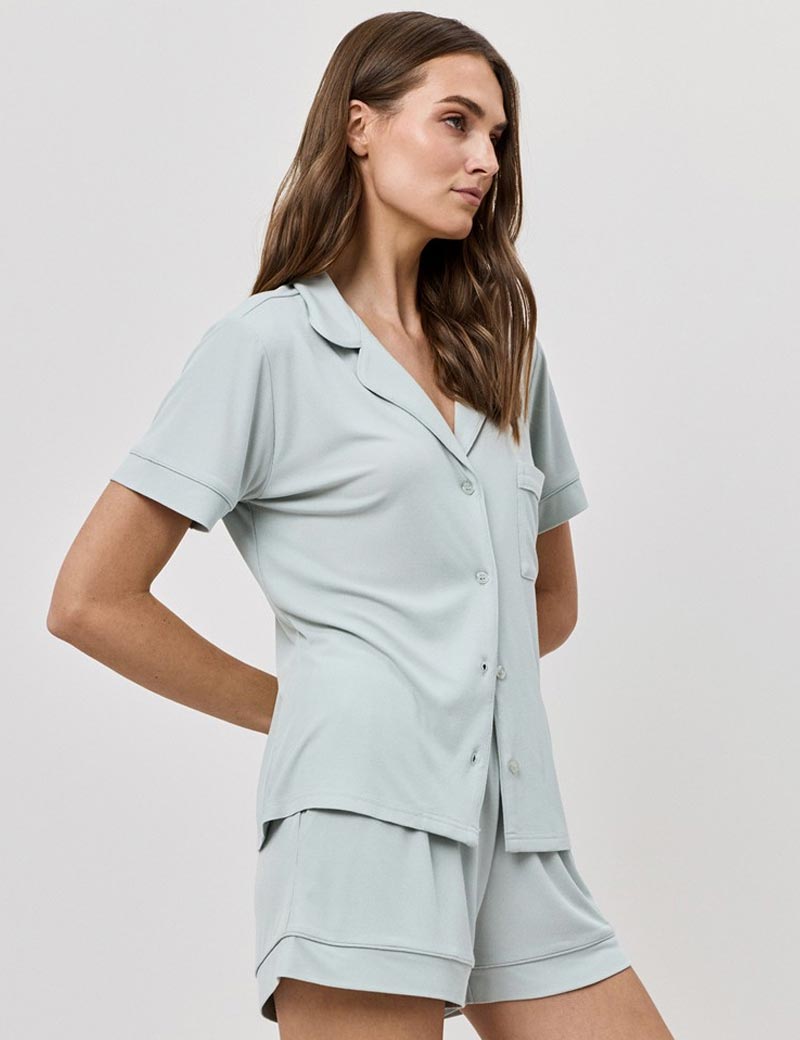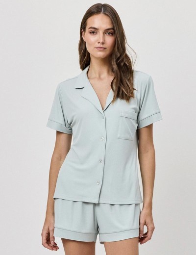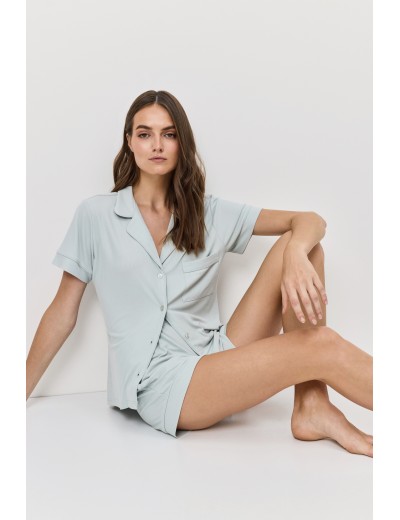 Женская пижама с шортами DOVE от литовского бренда Aruelle создана для обеспечения максимального комфорта во время сна. Выполнена в светло-мятном оттенке из модала, материала с мягкой текстурой в мелкий рубчик. Окантовка придает завершенность образу. Рубашка застегивается на пуговицы, имеет короткие рукава, отложной воротник и нагрудный карман. Шорты свободного покроя оснащены эластичным поясом и карманами по бокам.