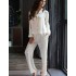Состоит из жакета с отложным воротником, с застежкой на пуговицы, с длинным втачным рукавом на манжете и прямых брюк свободного кроя на эластичной резинке в поясе, с карманами в боковых швах.