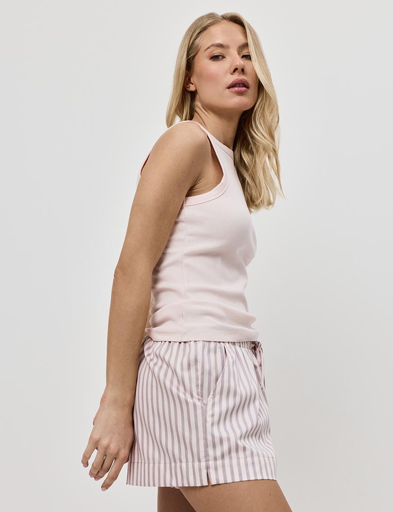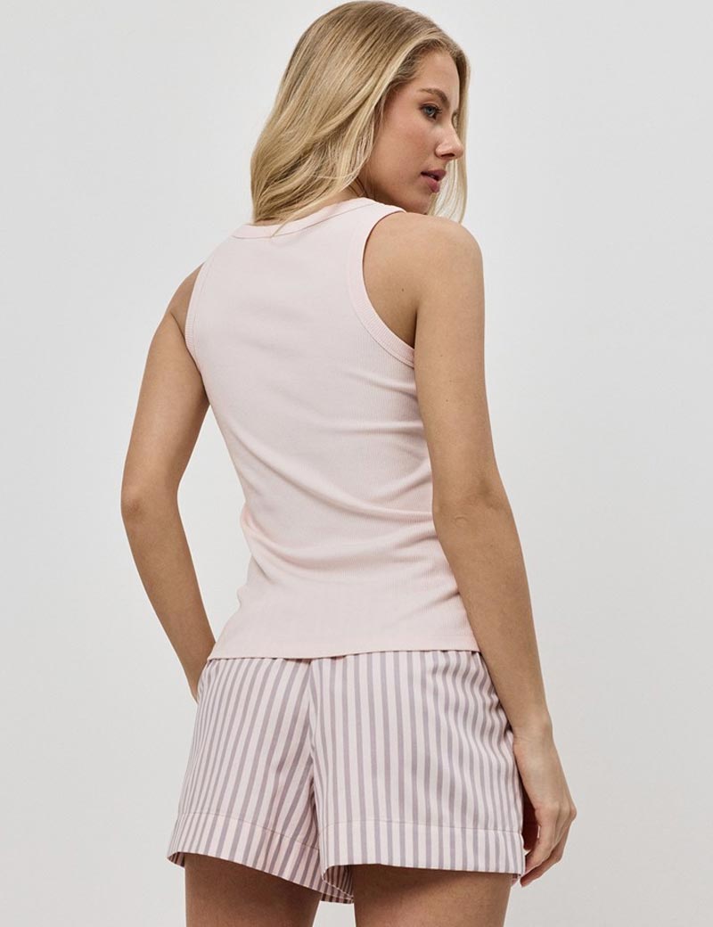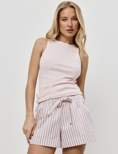 Пижамный комплект ELOWEN, созданный литовским брендом Aruelle, станет идеальным выбором для уютных вечеров и спокойных утренних часов. Включает в себя однотонную майку и полосатые шорты. Верх комплекта выполнен из приятной на ощупь ткани, в составе которой хлопок, вискоза и эластан, что обеспечивает комфорт. Шорты изготовлены из хлопка с добавлением шелковой нити.