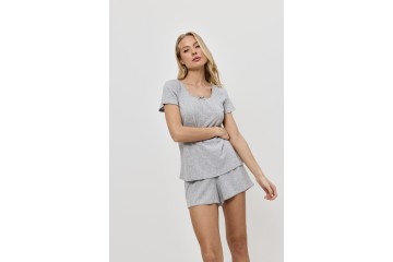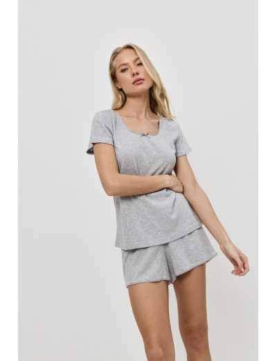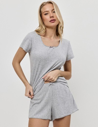 Уютная пижама NEVE от литовского бренда Aruelle выполнена из мягкой вискозной ткани в мелкий рубчик, светло-серого оттенка. В комплекте футболка и шорты, идеально подойдут для сна или в качестве одежды для безмятежного домашнего отдыха.