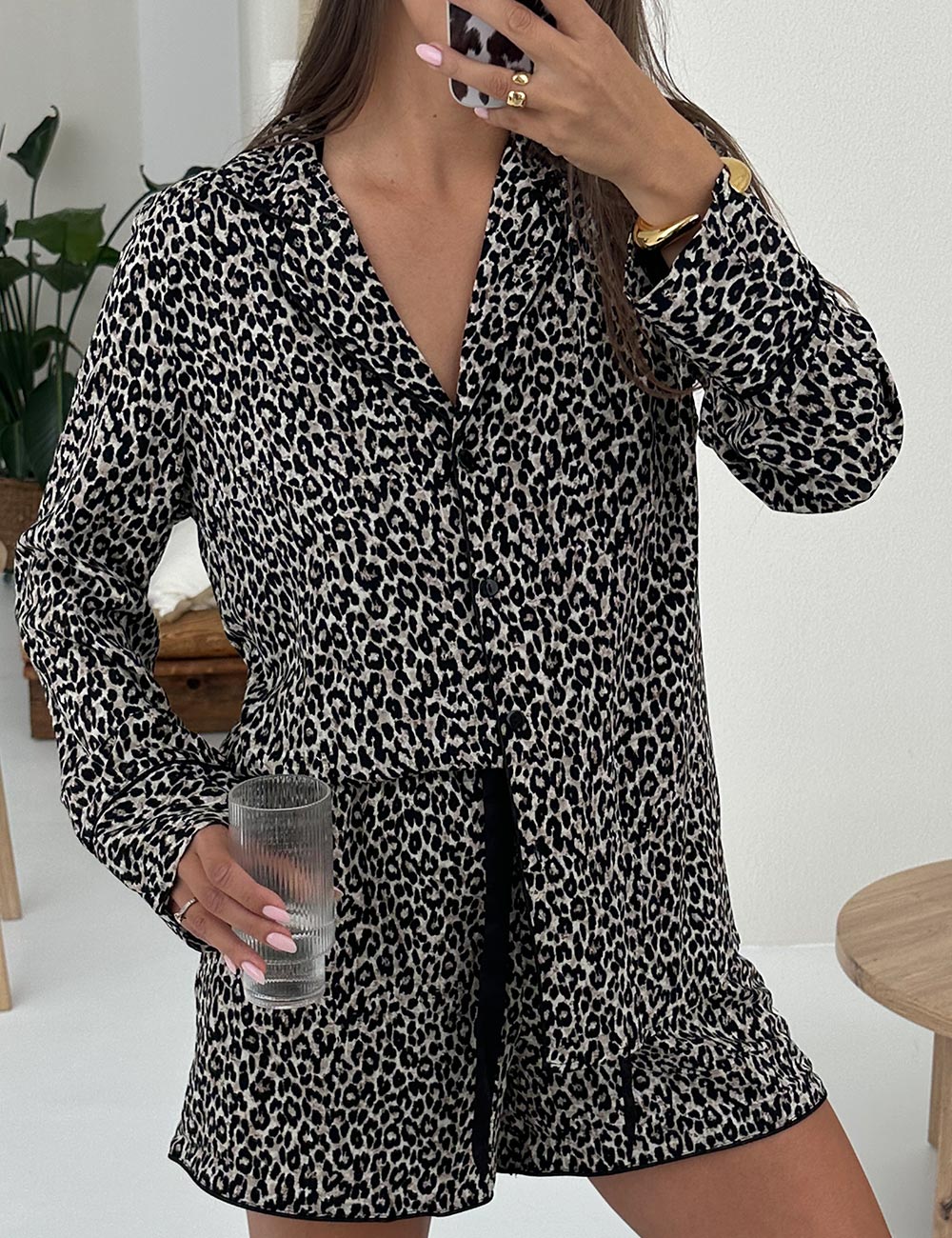 Женский пижамный комплект LEONA от литовского бренда Aruelle в леопардовой расцветке. Свободная рубашка и короткие шортики выполнены из вискозного полотна и дополнены контрастным кантом.
