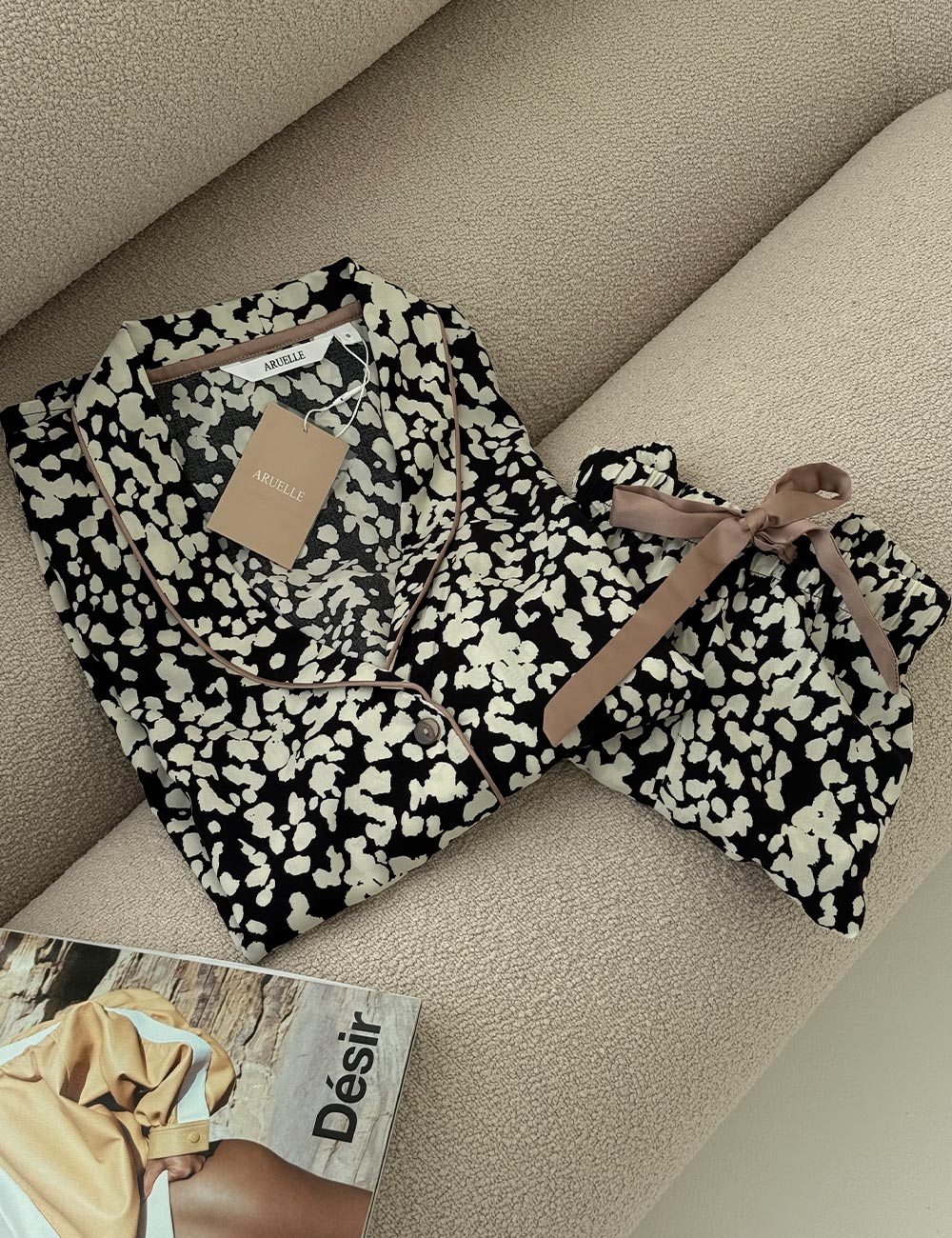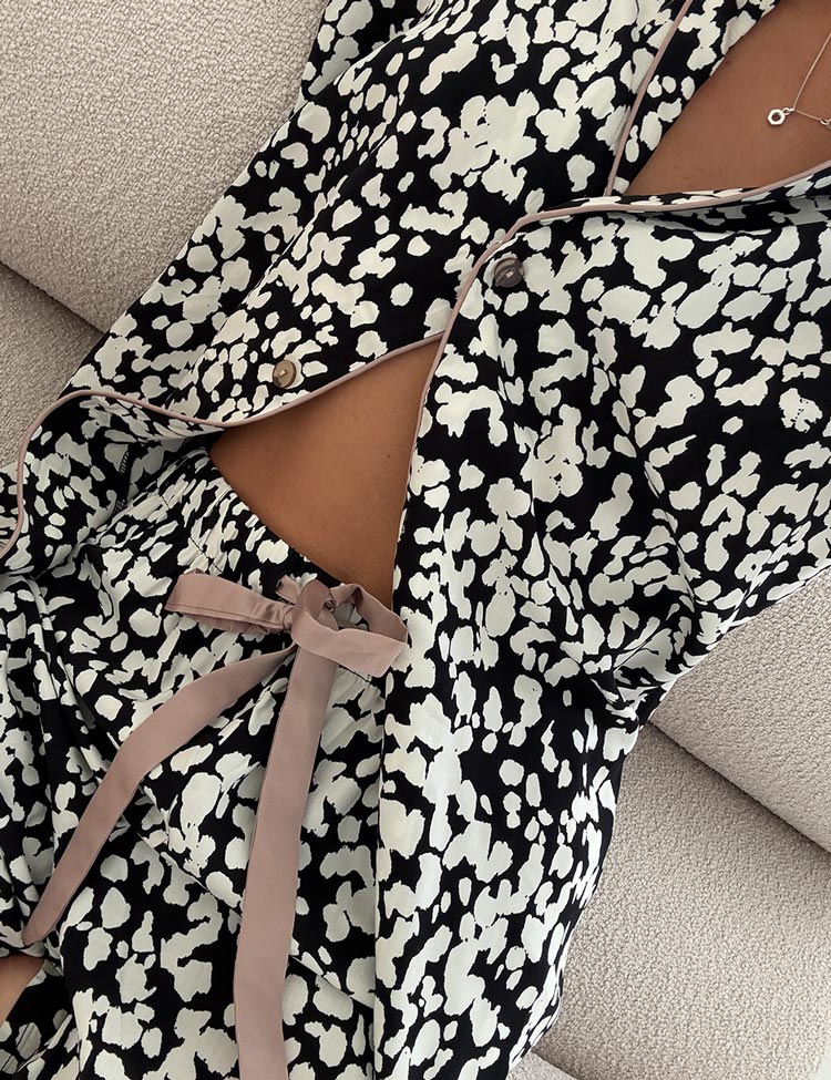 Пижама с короткими шортами SOLENE от литовского бренда Aruelle выполнена из мягкой вискозы с абстрактным принтом в черно-молочных тонах. Короткие шортики на эластичном поясе дополнены боковыми карманами, рубашка свободного кроя.