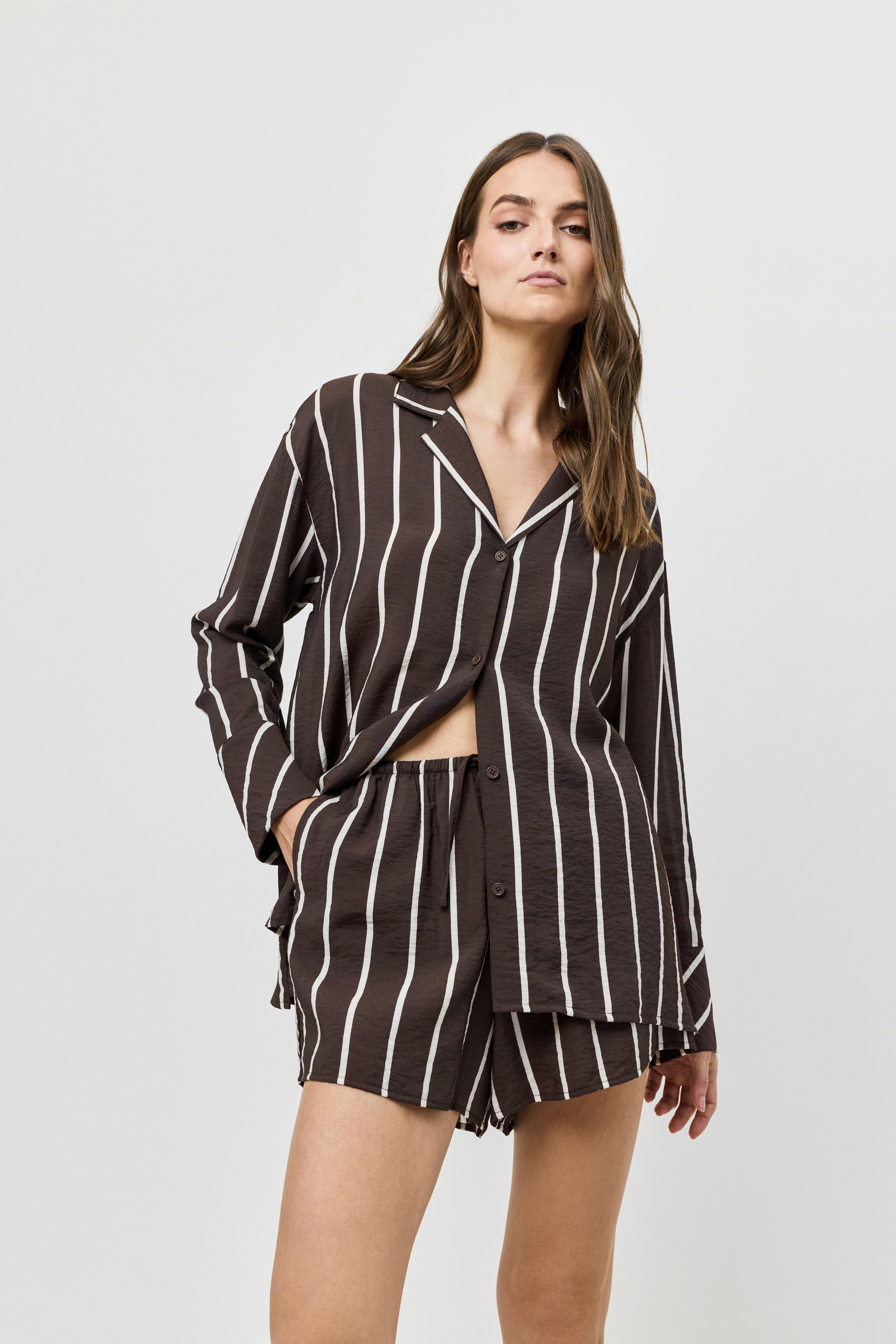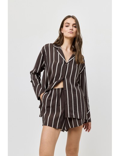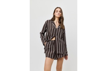 Женский комплект CEDAR SET от литовского бренда Aruelle состоит из рубашки на пуговицах и свободных шорт, выполнен из вискозы с добавлением нейлона в насыщенной шоколадной расцветке с вертикальными кремовыми полосками. Лёгкость и уют, созданные для спокойных прогулок или морских путешествий.