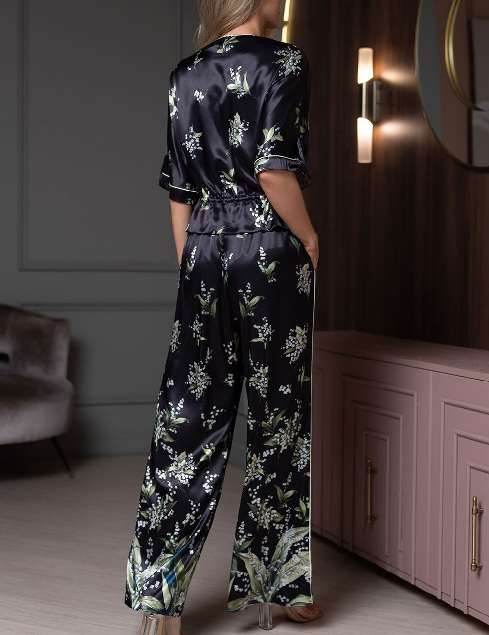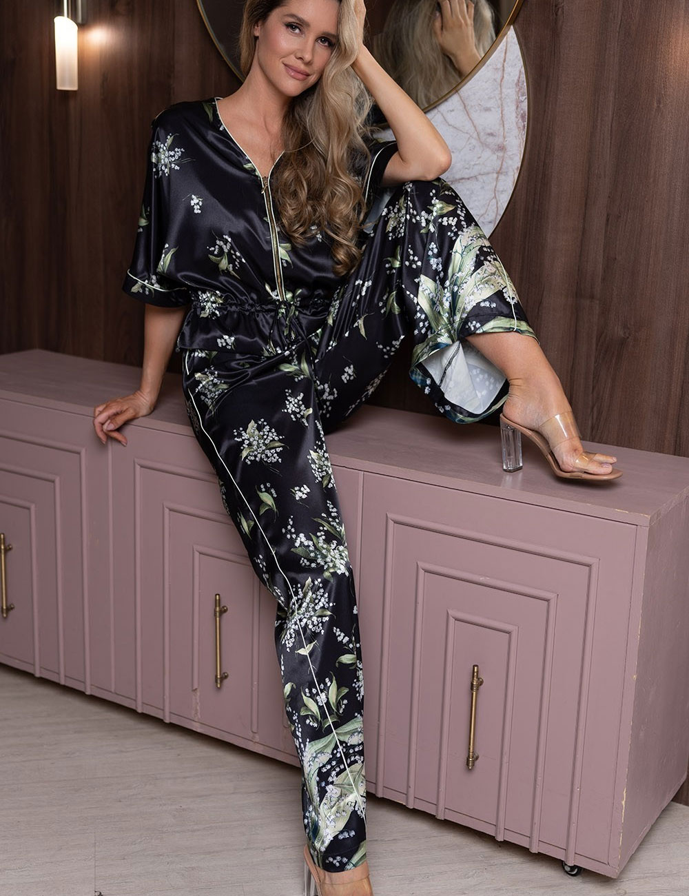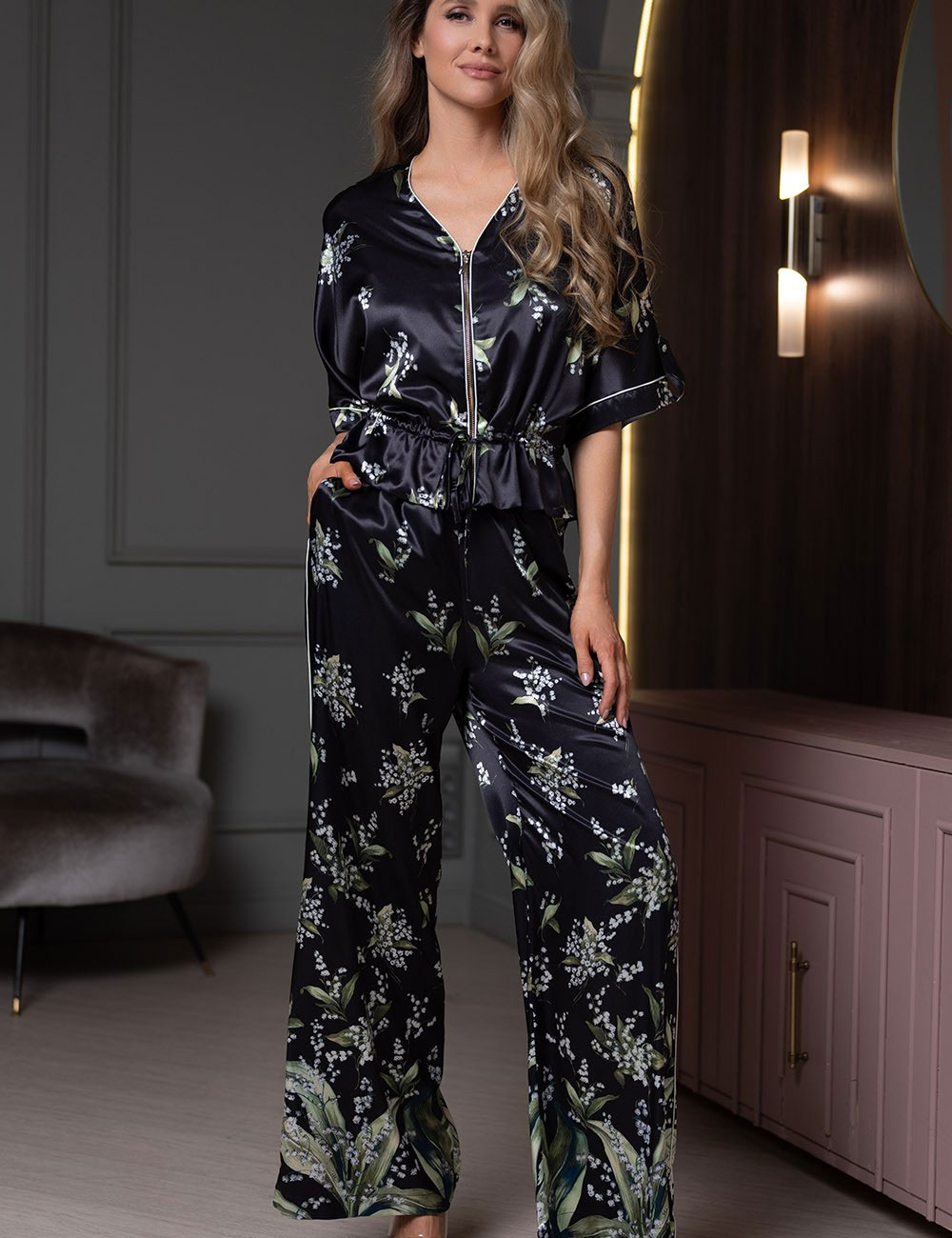 Оригинальный домашний костюм Mia-Amore 4555 из коллекции LURDES — это лёгкий бомбер с молнией и широкие брюки из натурального шёлка с тёмным принтом ландышей. Стильный комплект для тех, кто ценит комфорт и эстетику даже в повседневной рутине.