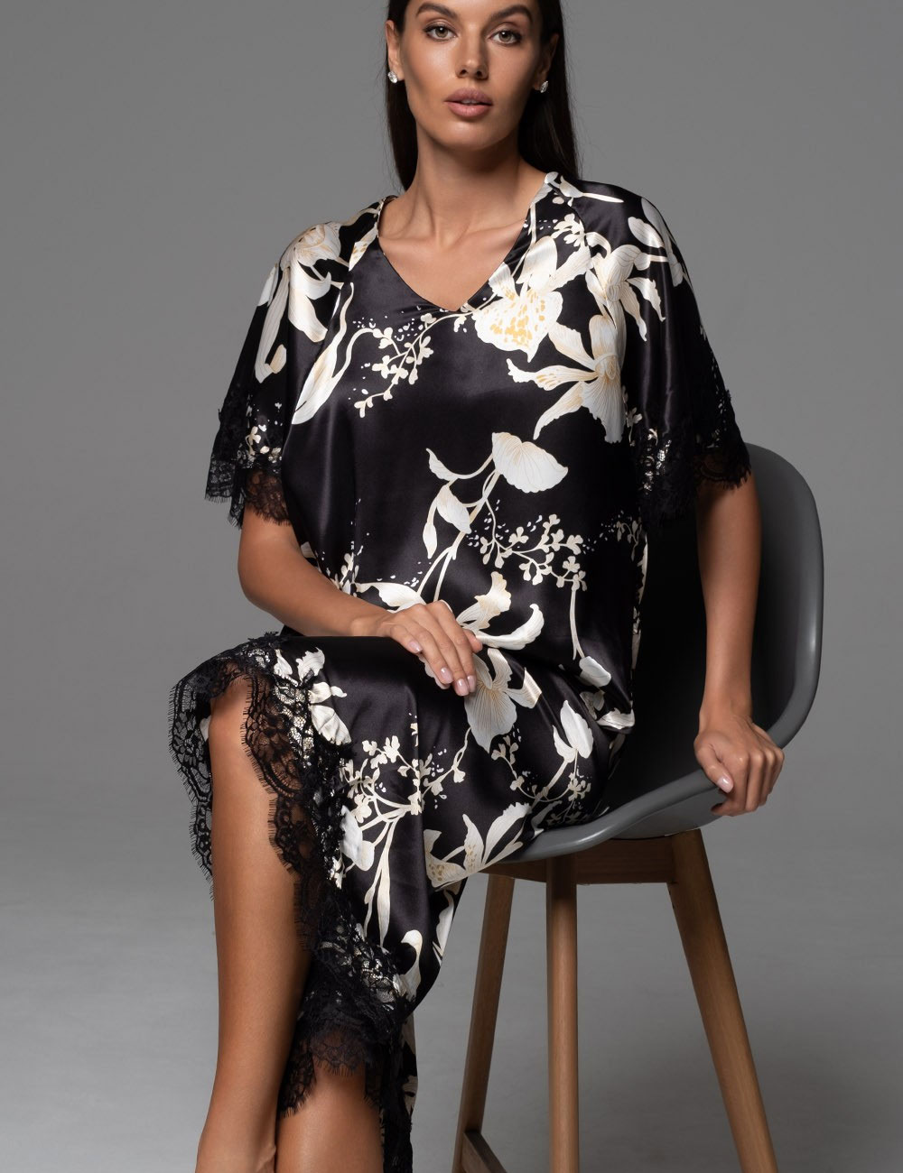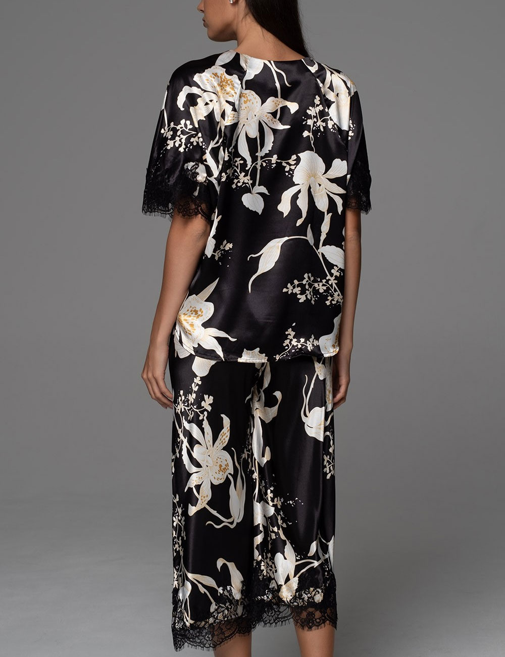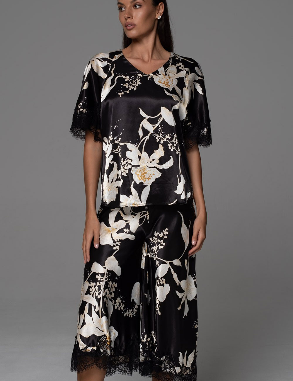 Стильная пижама ARABEL 4775 от Mia-Amore с блузой и укороченными расклешёнными брюками. Блестящий смесовый шёлк чёрного цвета с белыми крупными орхидеями пробуждает эмоцию спокойной женственности. Лёгкое французское кружево добавляет нотку романтики. Идеальна для сна — для женщин любых размеров, ведь комфорт и элегантность не знают границ!
