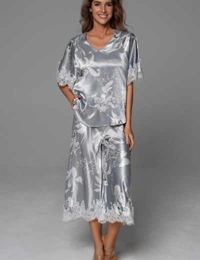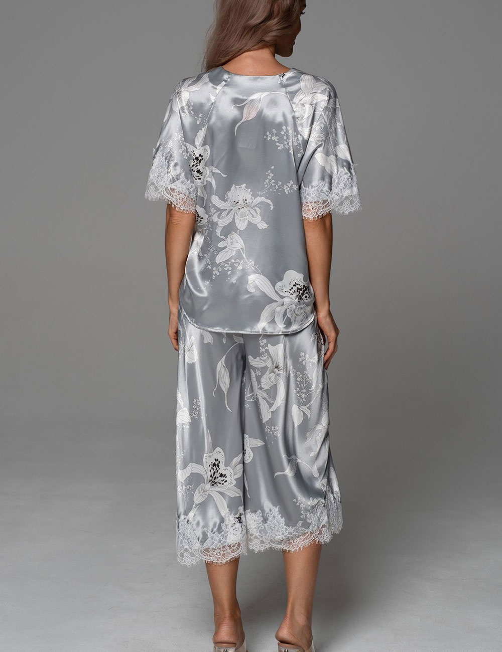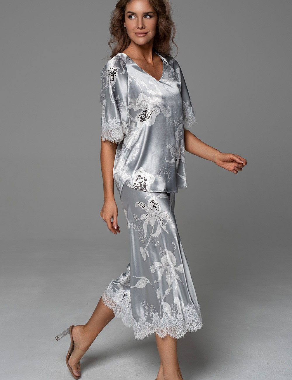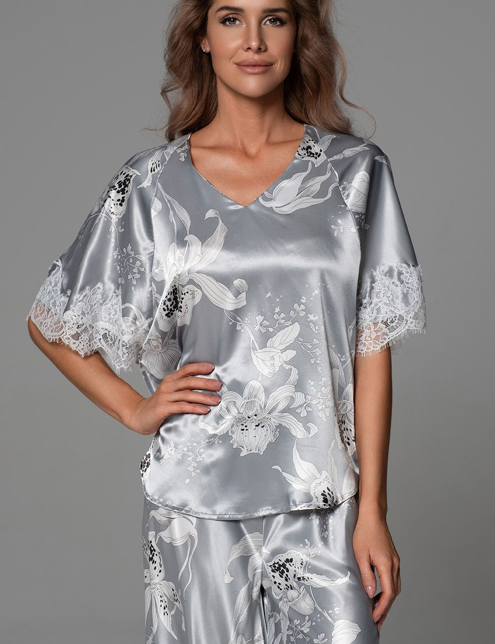 Нарядная пижама ARABEL 4775 от Mia-Amore с блузой и укороченными расклешёнными брюками. Блестящий смесовый серебристый шёлк с белыми крупными орхидеями пробуждает эмоцию спокойной женственности. Лёгкое французское кружево добавляет нотку романтики. Идеальна для сна — для женщин любых размеров, ведь комфорт и элегантность не знают границ!