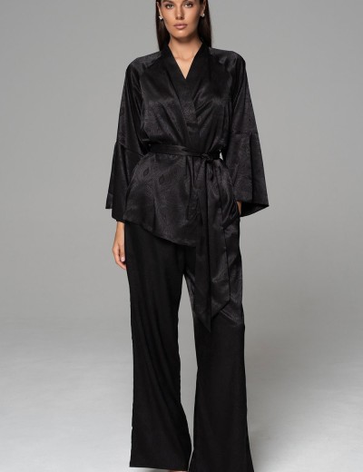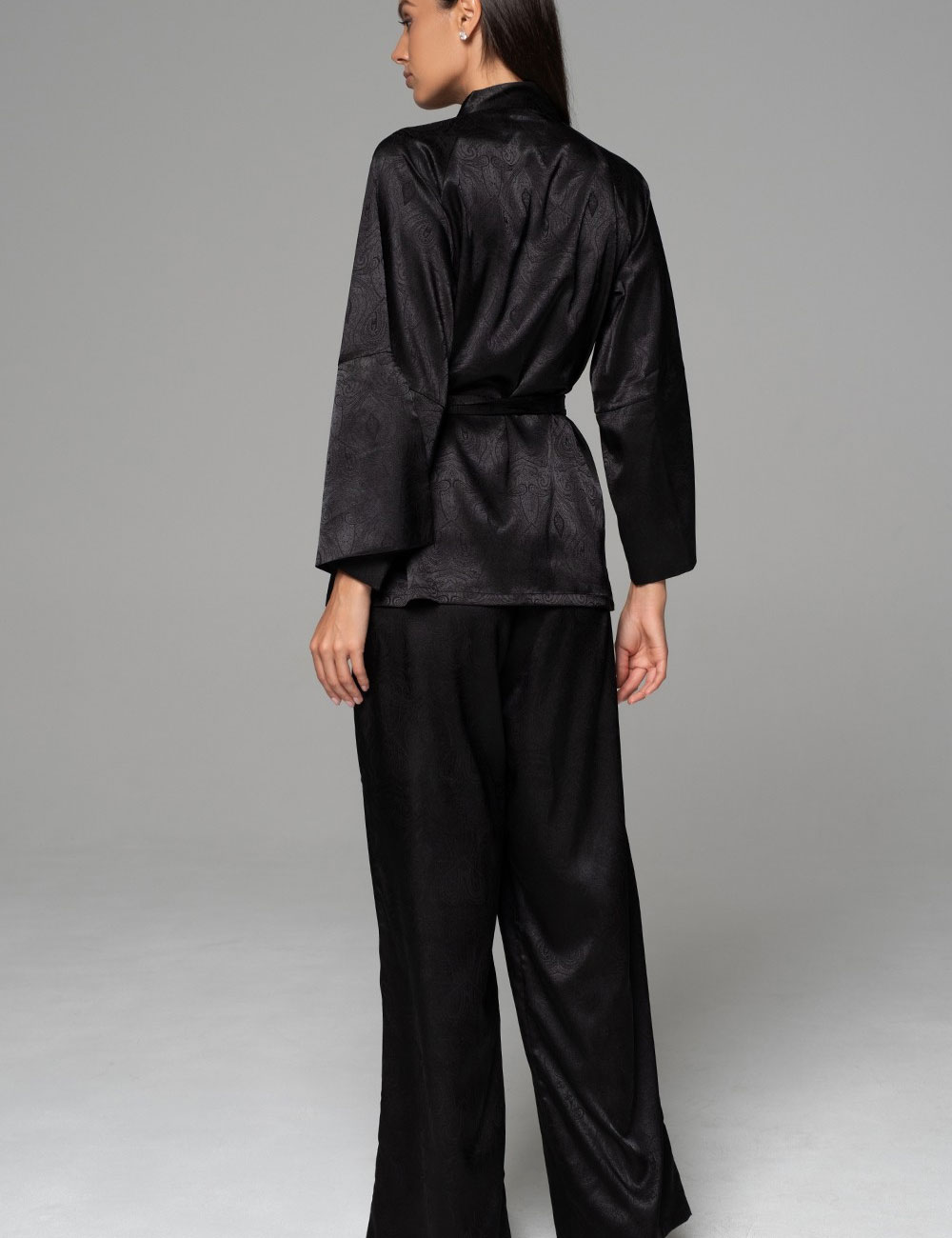 Изящная чёрная пижама Mia-Amore ANORA модель 4805 включает топ на тонких бретелях, широкие брюки и запашной жакет из смесового натурального шёлка с гипнотическим жаккардовым узором. Создает элегантную атмосферу для вечернего отдыха, даря ощущение заботы, которое не зависит от модных трендов.