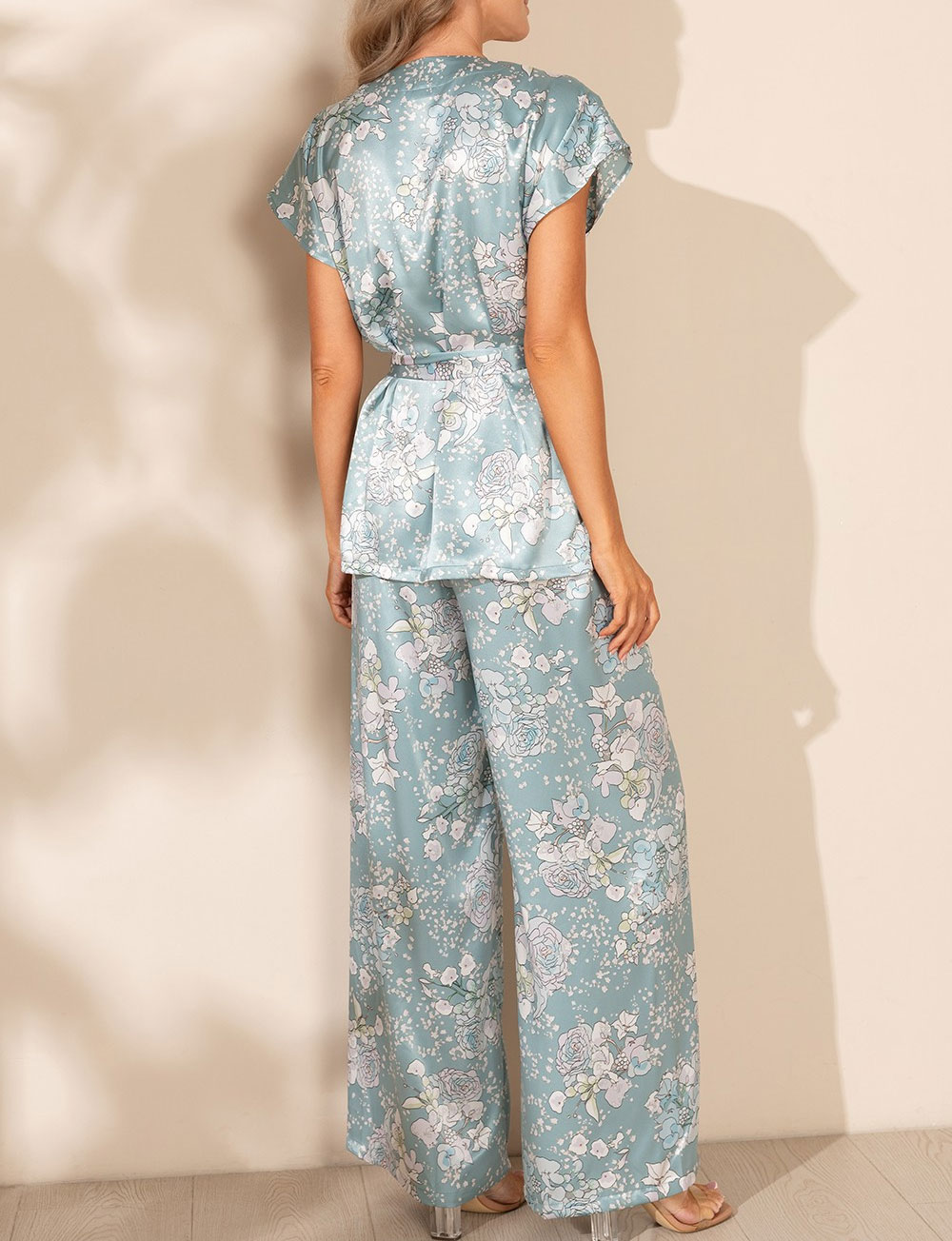 Пижама AIRIS 4876 от Mia-Amore из нежного смесового шёлка с едва уловимым блеском. Бирюзовый фон с тонким растительным принтом в бело-розовых тонах создаёт ощущение сада после дождя. Запашный жакет и широкие палаццо — идеальный баланс уюта и элегантности для тихих утренних часов, когда хочется чувствовать себя нимфой, а не просто женщиной.
