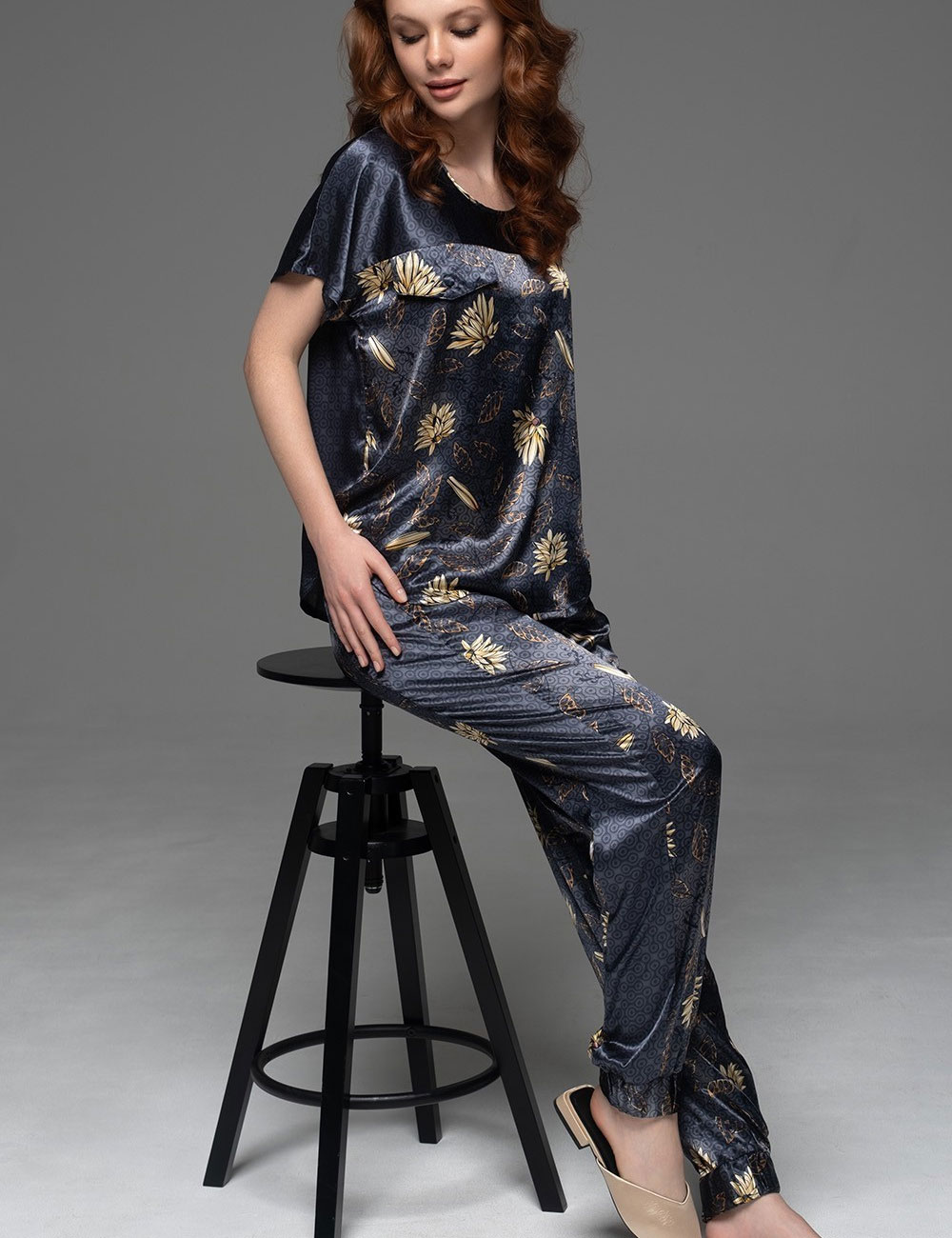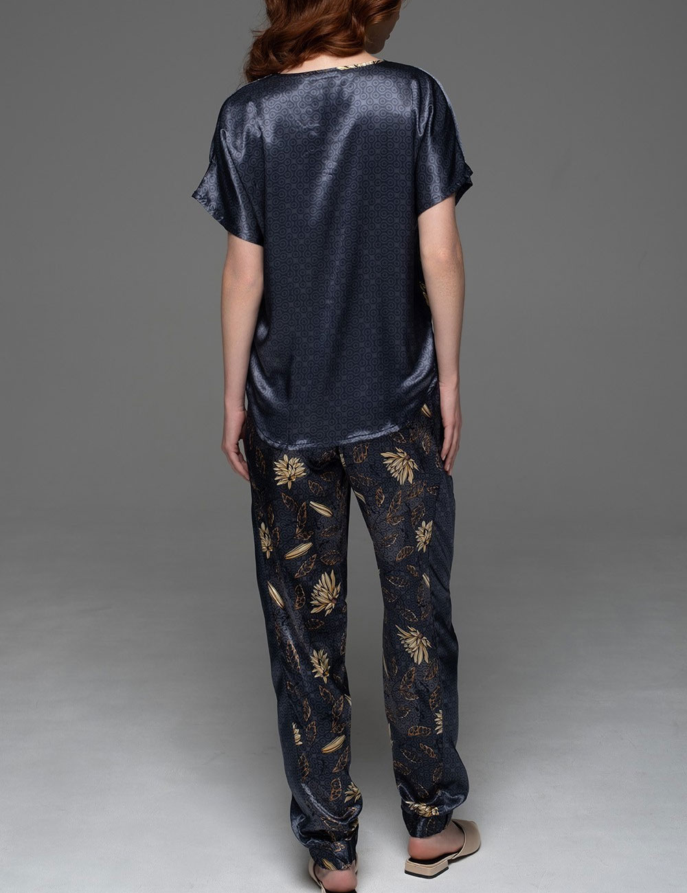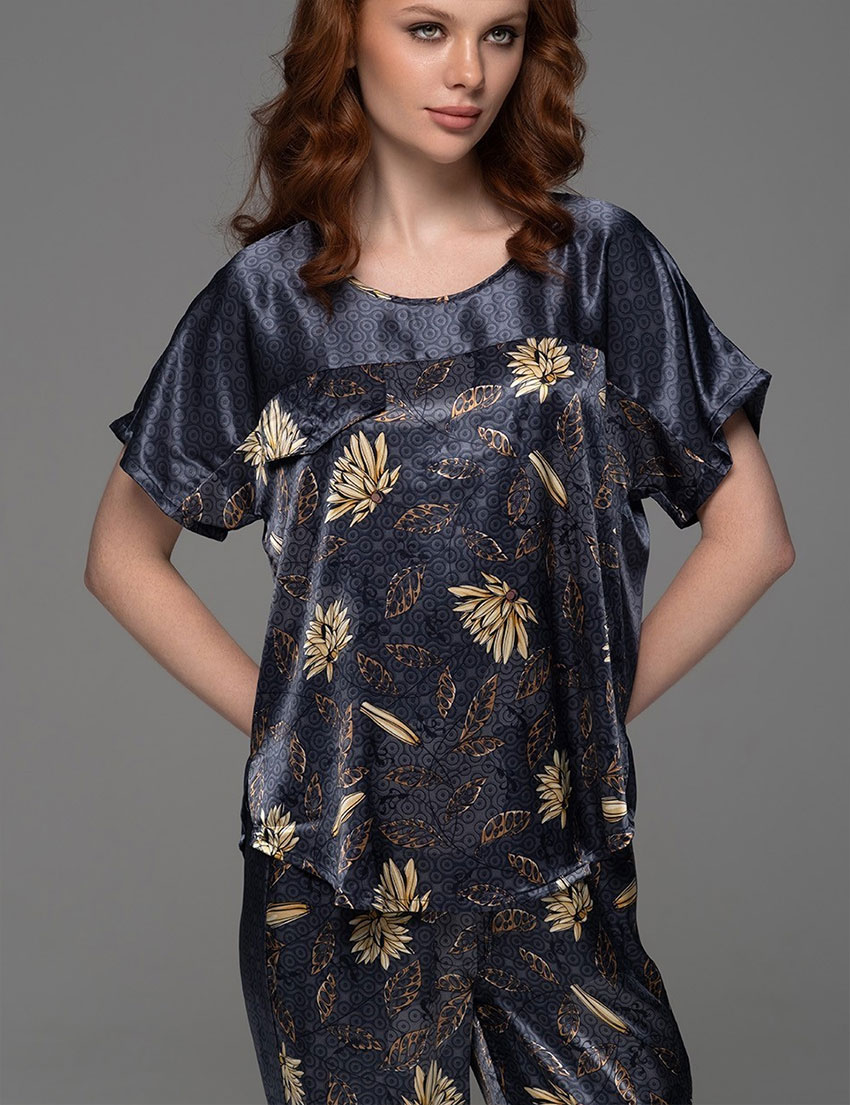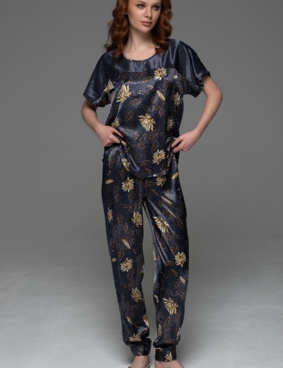 Женская пижама MARYGOLD 4694 от Mia-Amore — абсолютный комфорт для сна и отдыха из смесового натурального шёлка с мягким блеском. Принт с бежевыми бутонами, листьями и геометрическим орнаментом оживает на синем фоне, создавая природную гармонию. Свободный топ и брюки с манжетами воплощают вневременный домашний стиль — идеально для женщин, ищущих уют, как объятия любимого одеяла.