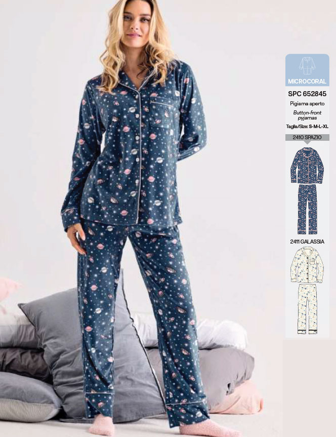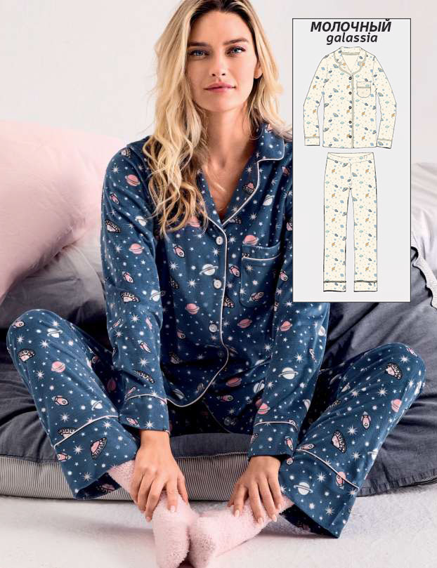 Женская утеплённая пижама SPACE TRIP SPC2845 от Infiore — нежный микрофлис светлого молочного цвета, словно облако рассвета, нежно окутывает тело. На ткани таинственно плывут галактики, переплетённые с изящными летающими тарелками — будто сны. Рубашка на пуговицах и прямые брюки дарят тепло и лёгкую невесомость.