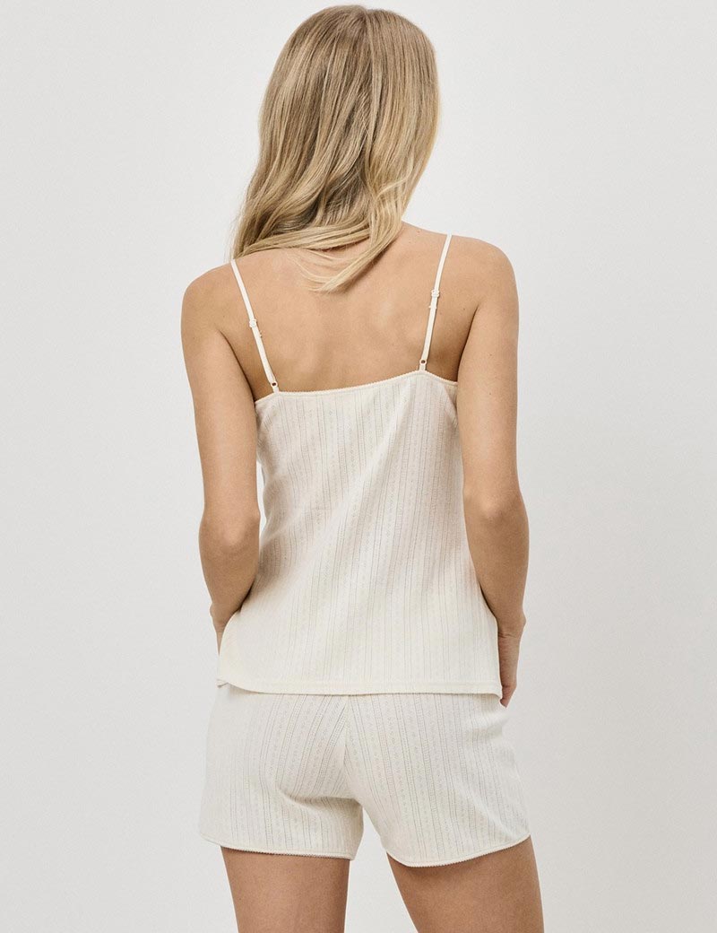 Пижама CAMBRIA от Aruelle, выполненная из нежного перфорированного хлопка в пастельных тонах экрю, станет отличным решением для создания уютного и женственного домашнего образа. Включает в себя топ на регулируемых бретелях и короткие шортики.
