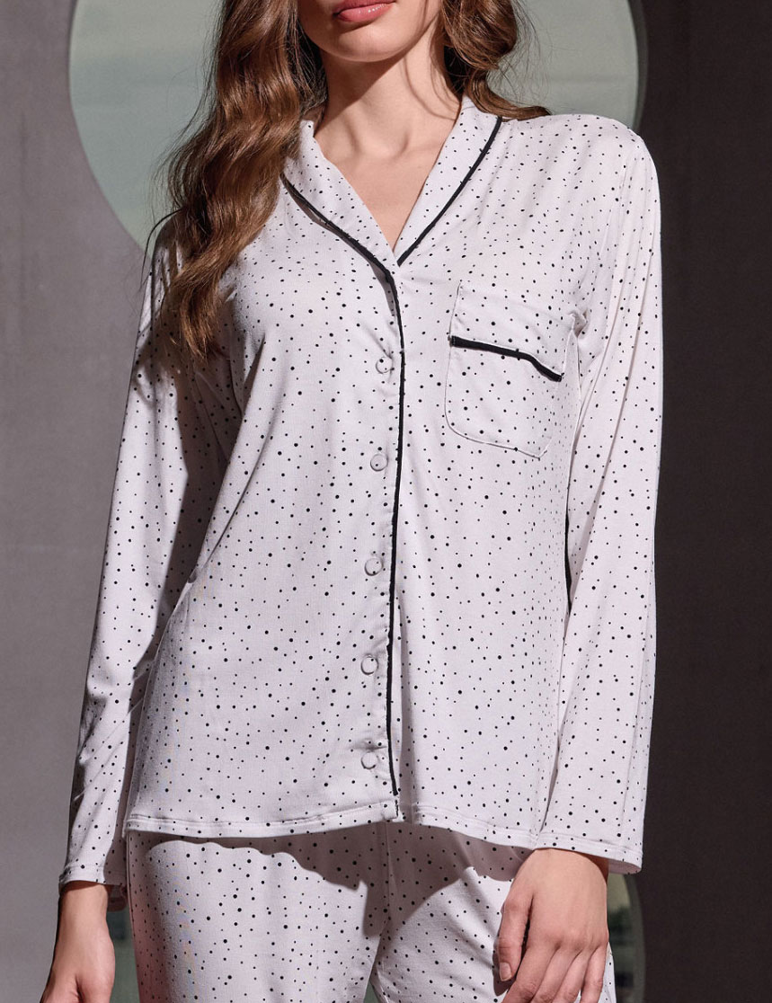 Пижама Lormar BLOGGER 654049LU в нежном оттенке latte выполнена из легкого вискозного полотна с принтом в мелкий горошек. Рубашка на пуговицах и длинные брюки дополнены контрастной отделкой, подчеркивающей силуэт. Этот элегантный комплект с вневременным дизайном дарит телу нежность и создает расслабленное настроение для уютного сна.